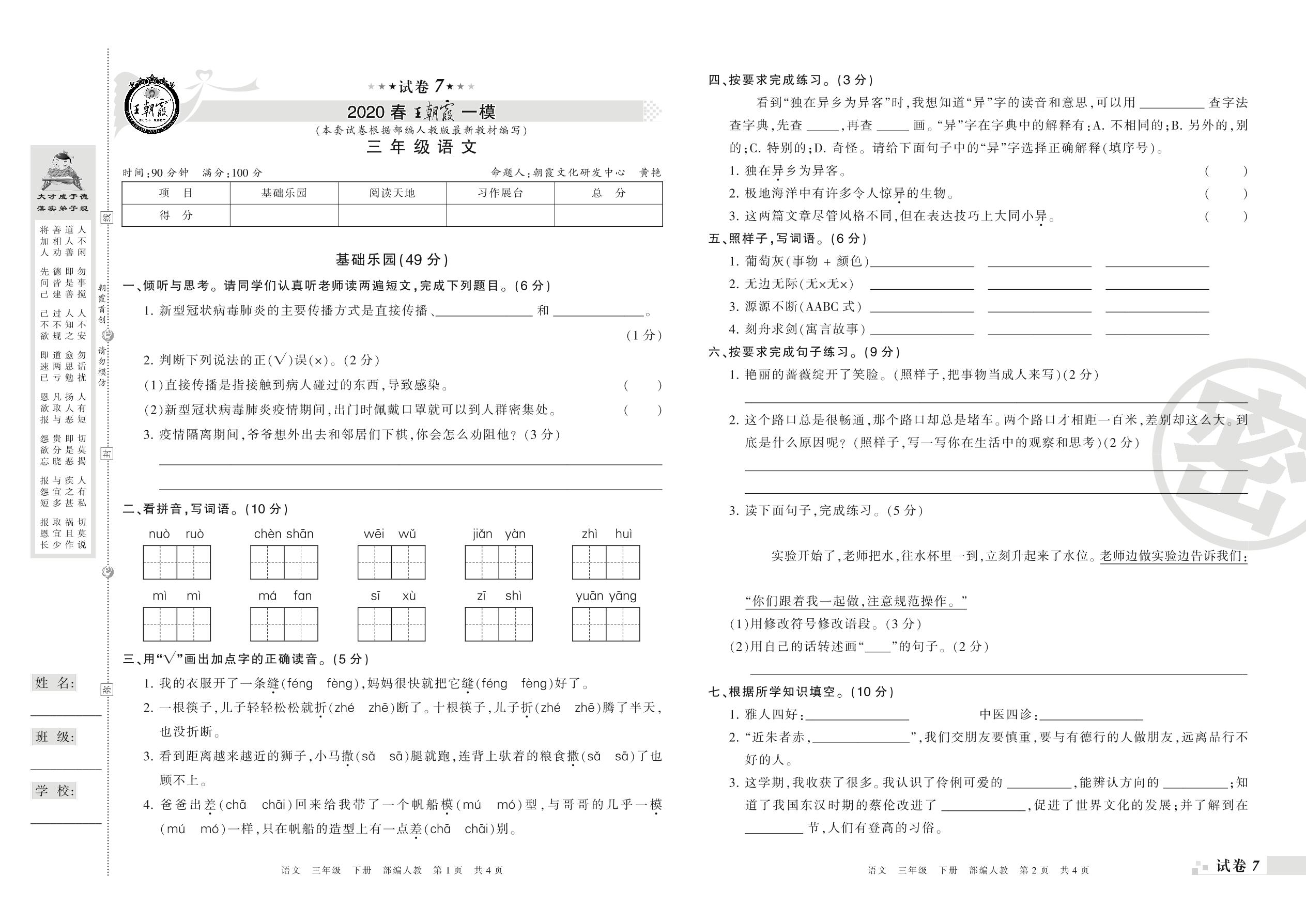王朝霞期末模拟卷三年级下册语文(人教版)_R21080190352【7】