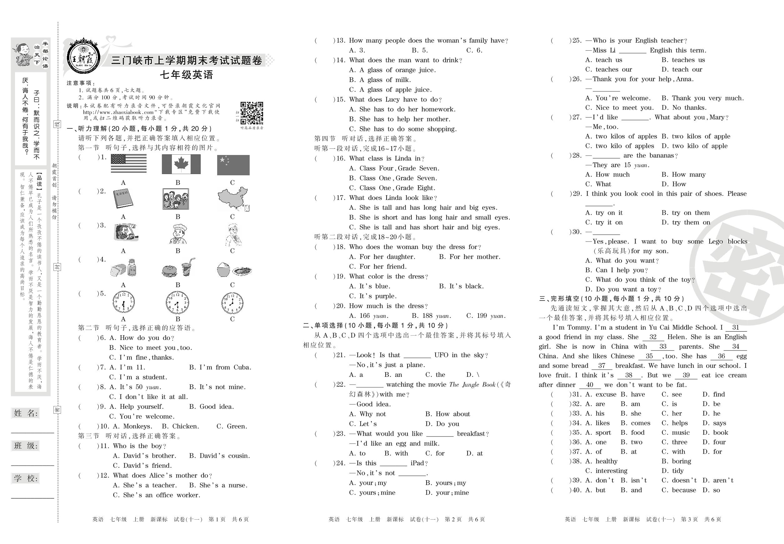 2016-2017学年第一学期三门峡市七年级英语试卷(新课版)【11】