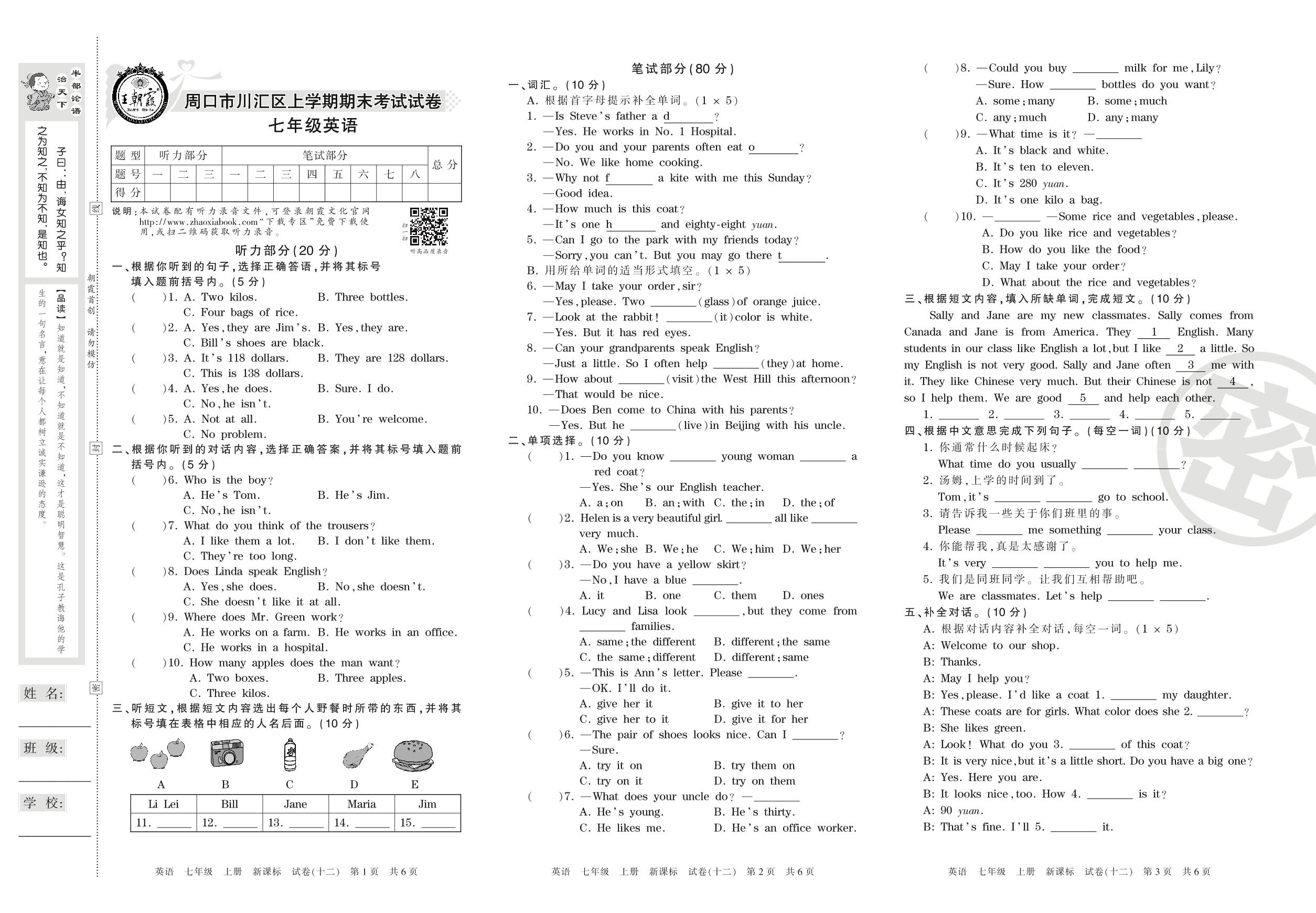 2016-2017学年第一学期周口市川汇区七年级英语试卷(新课版)【12】