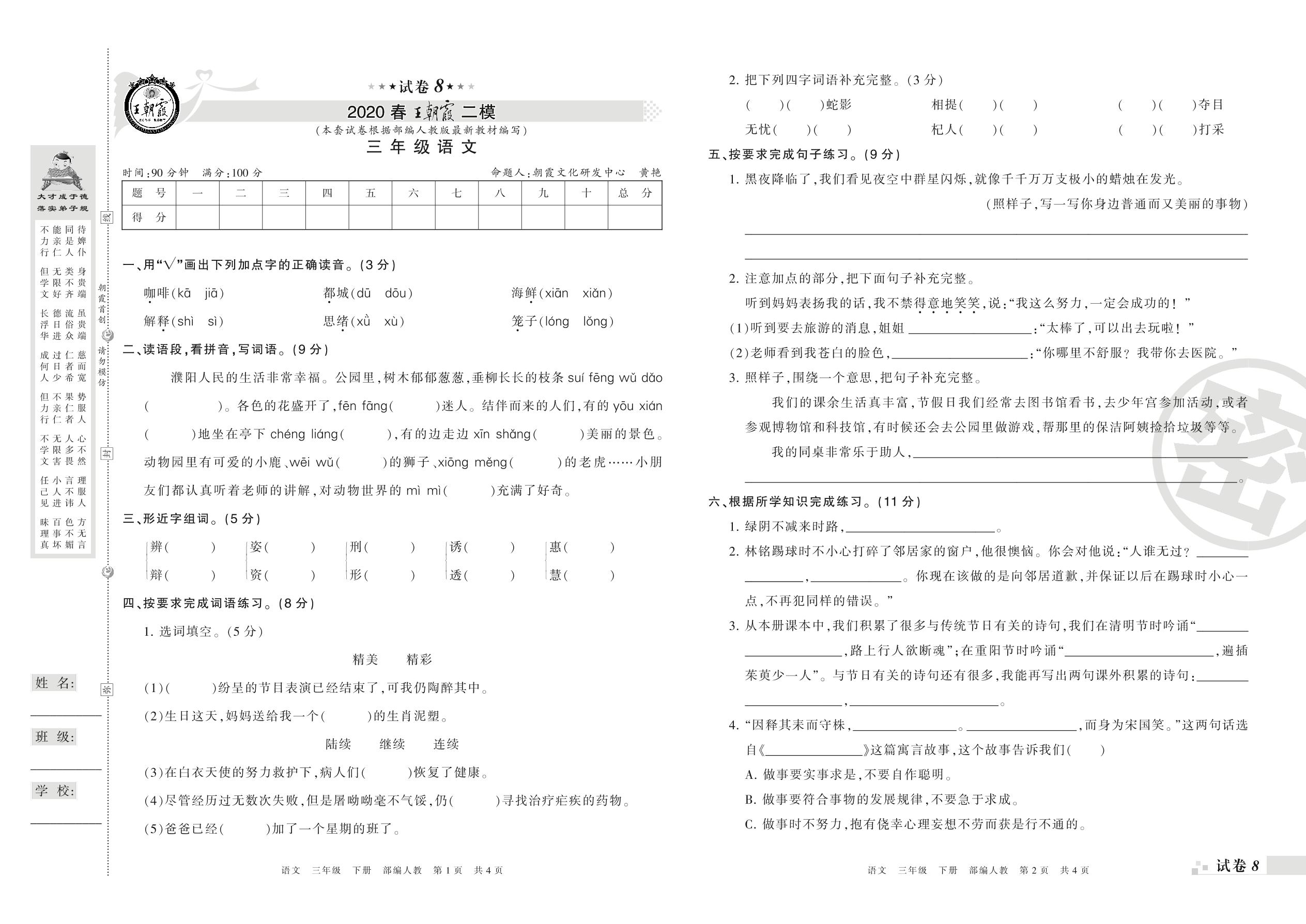 王朝霞期末模拟卷三年级下册语文(人教版)_R21080190357【8】