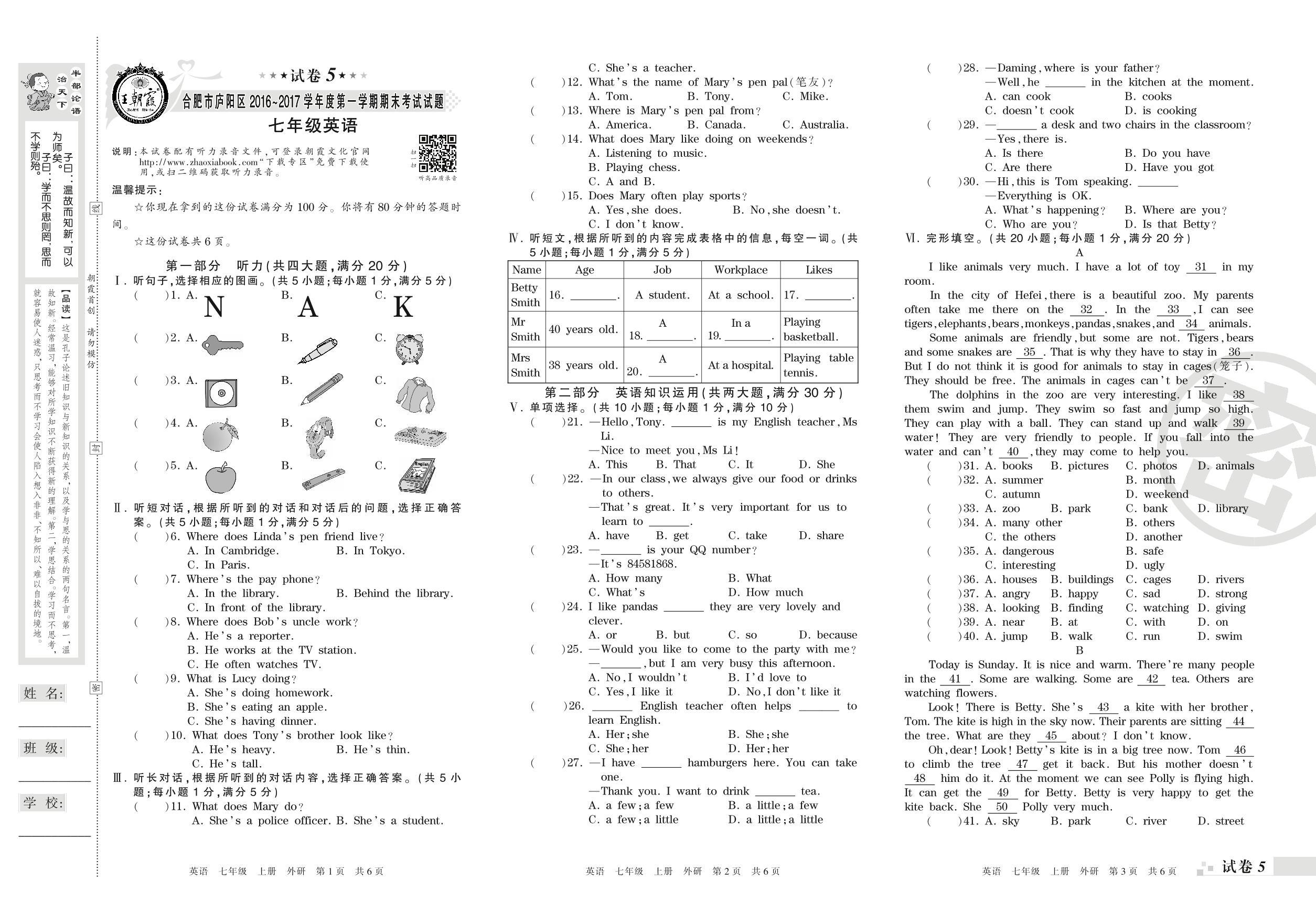 2016-2017学年第一学期合肥市庐阳区七年级英语试卷(外研版)【5】