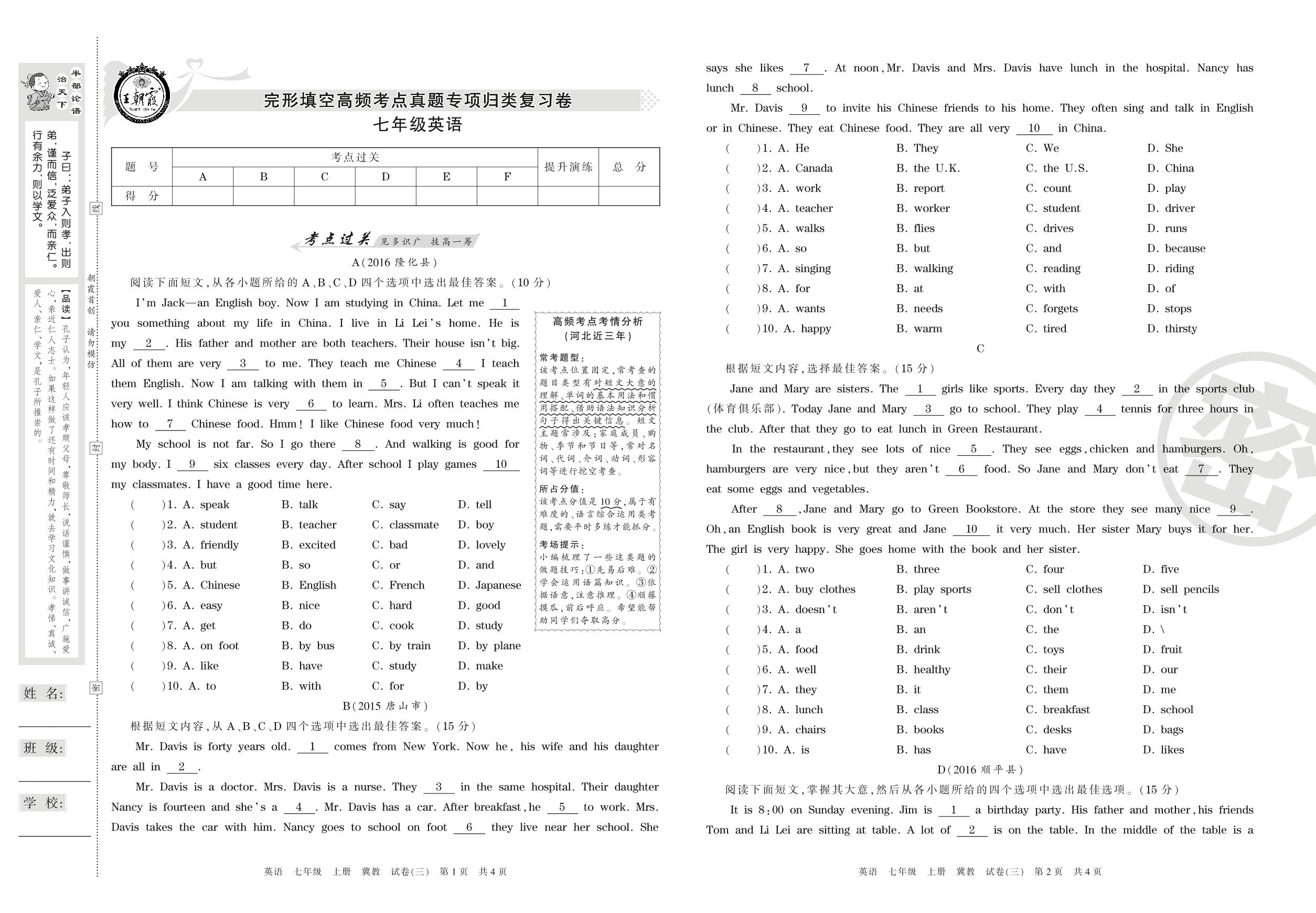 王朝霞期末专项卷七年级上册英语(冀教版)【3】