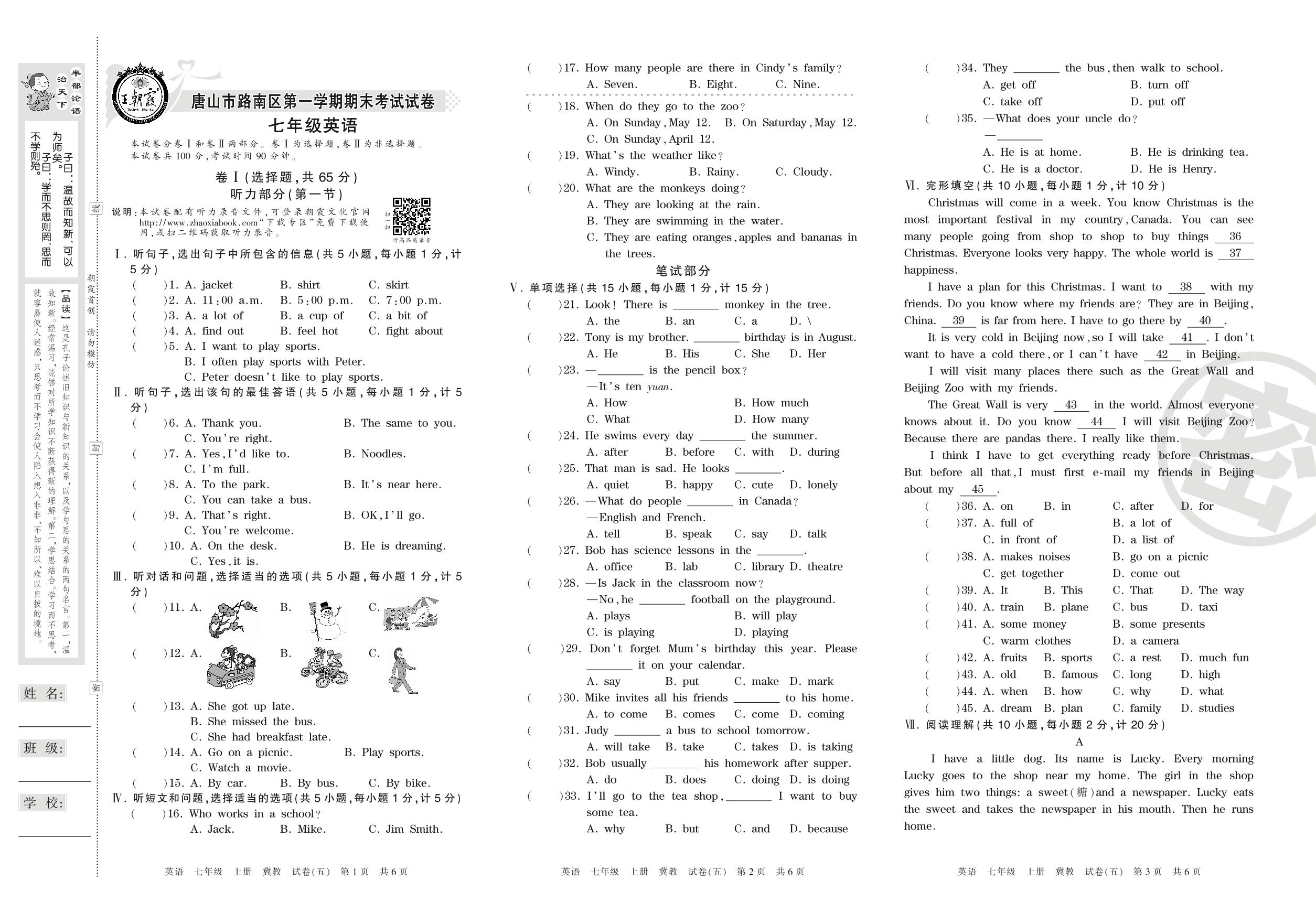 2016-2017学年第一学期唐山市路南区七年级英语试卷(冀教版)【5】