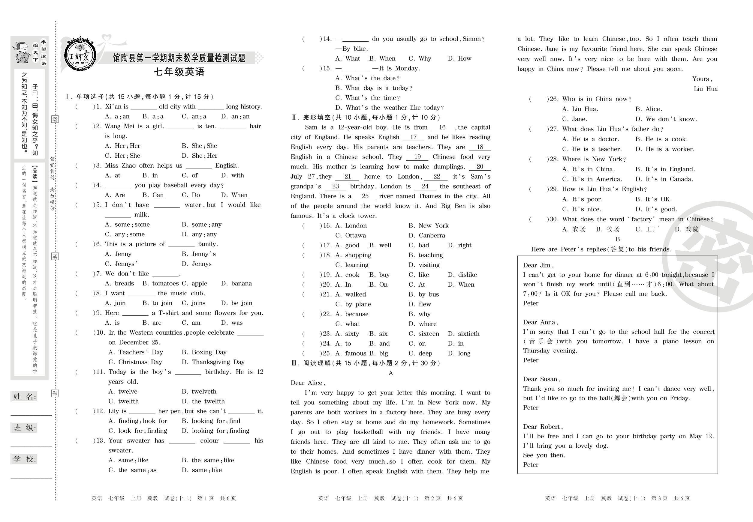 七年级英语冀教版上册期末卷