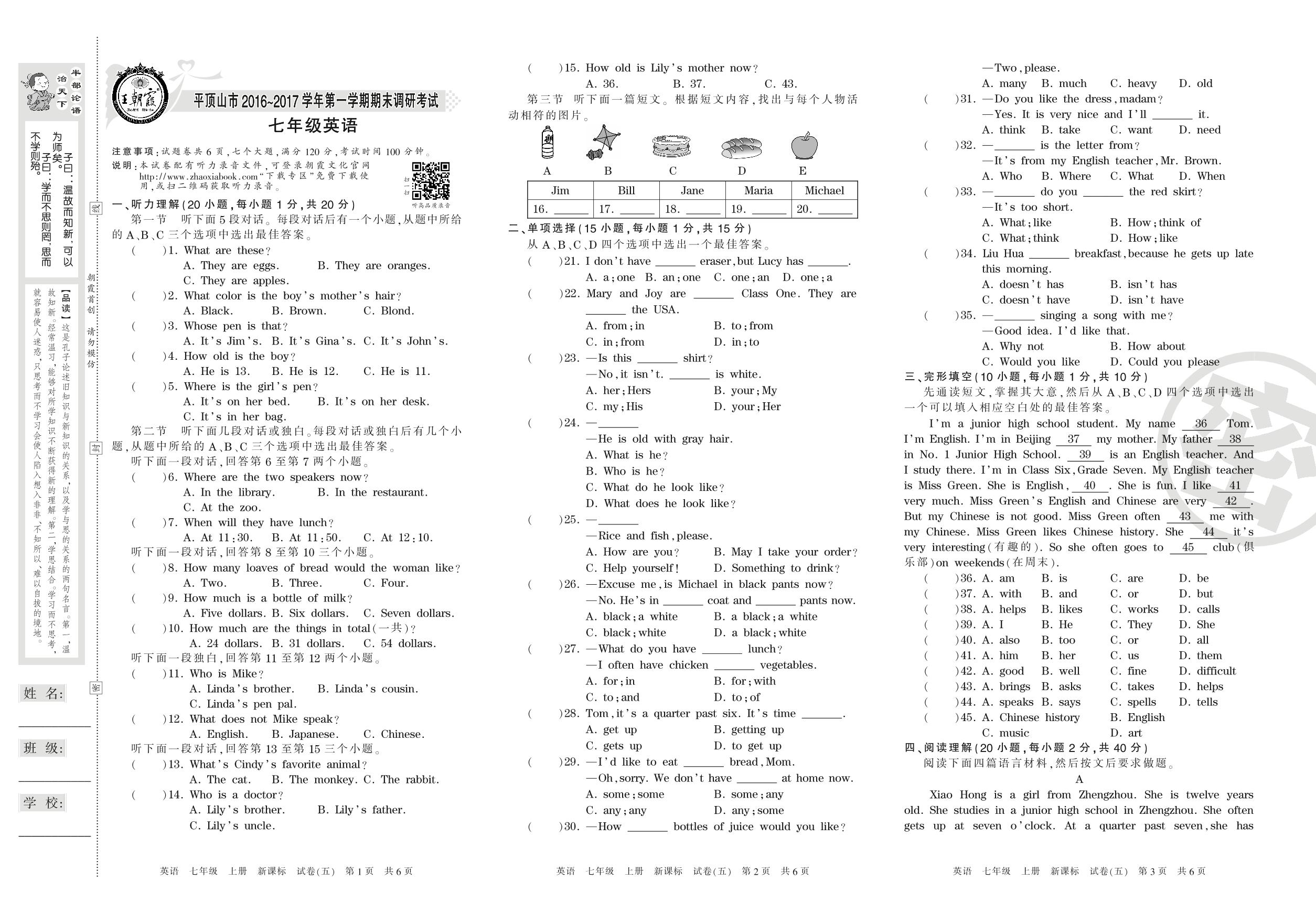 2016-2017学年第一学期平顶山市七年级英语试卷(新课版)【5】