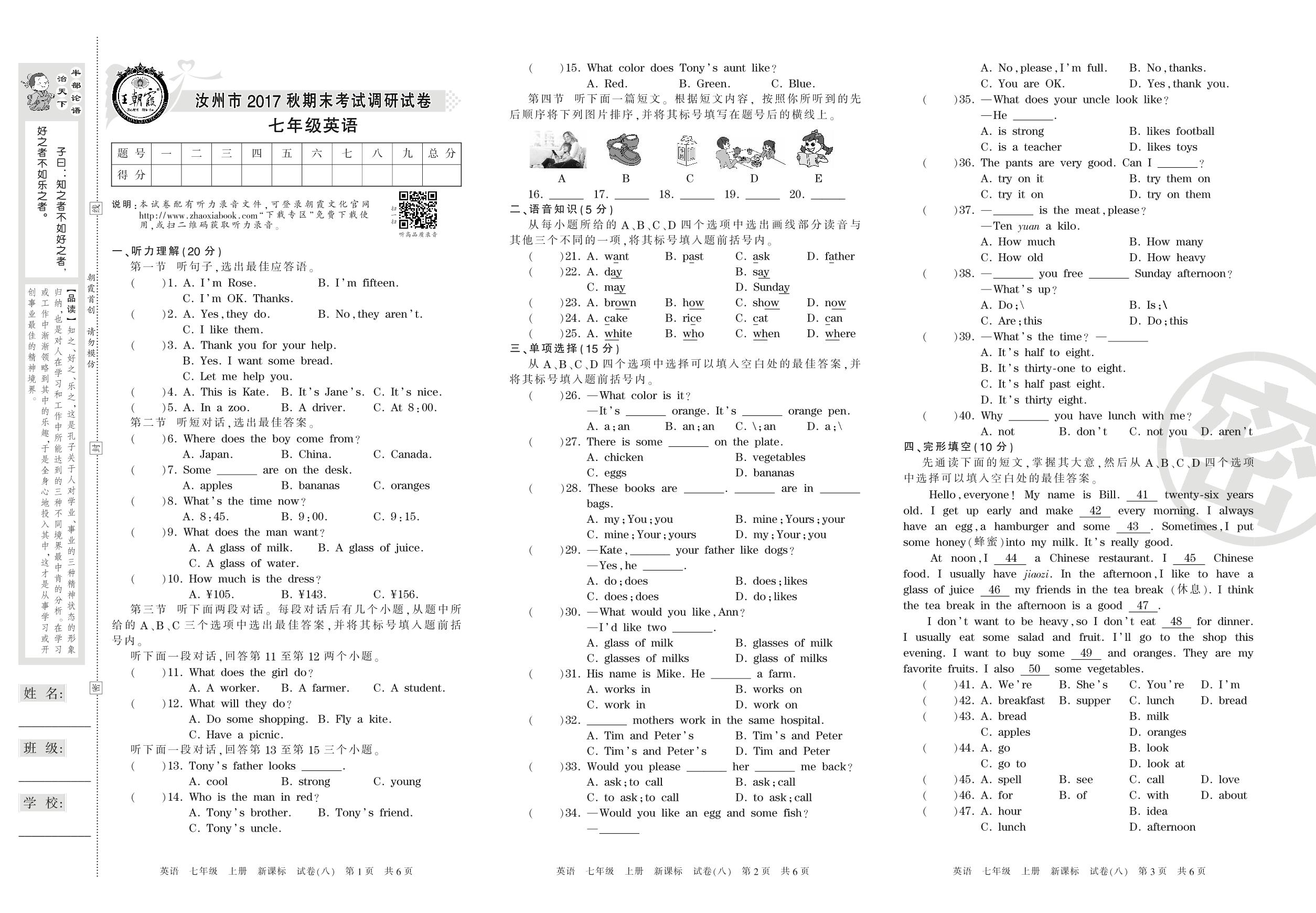 2016-2017学年第一学期汝州市七年级英语试卷(新课版)【8】