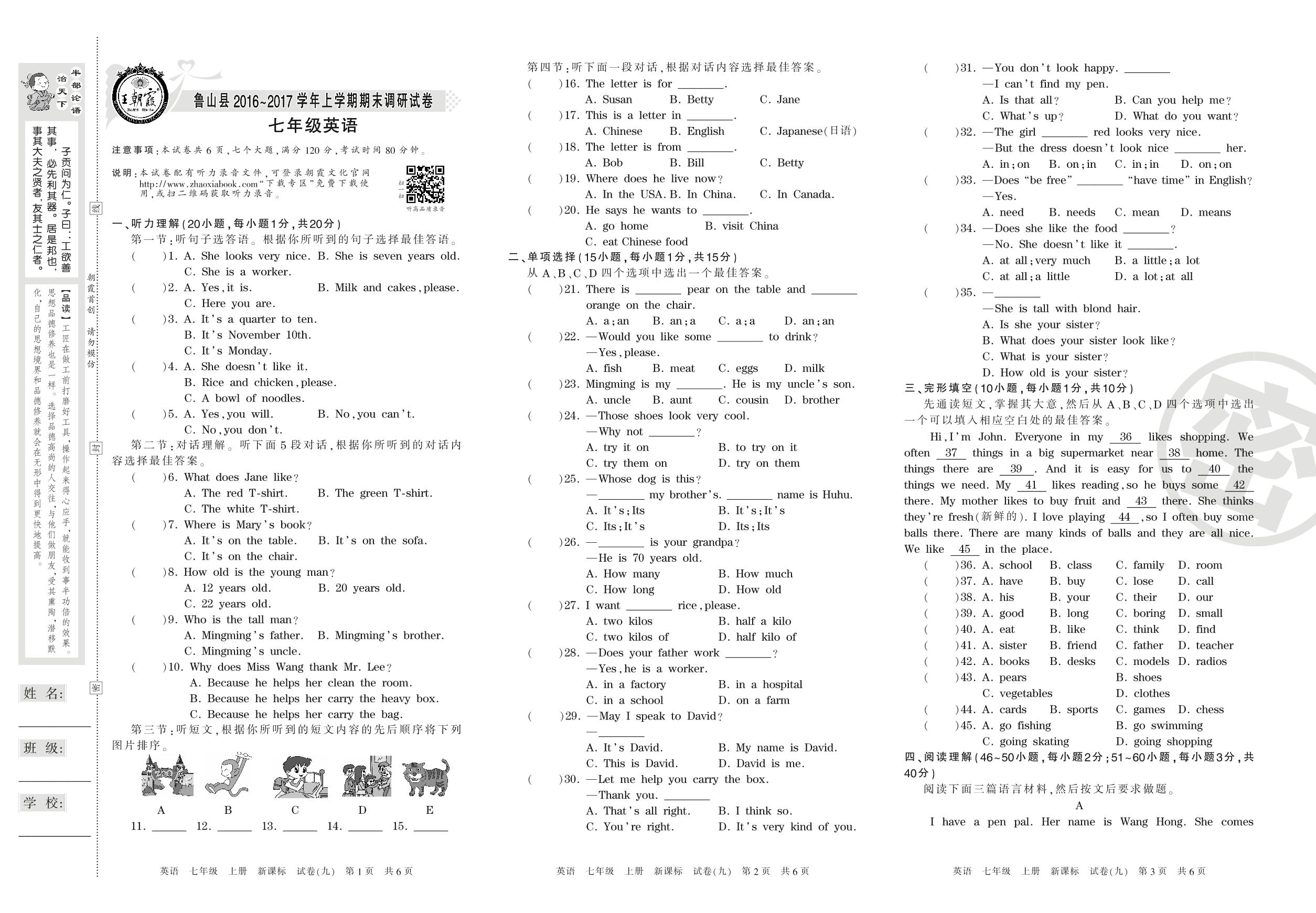 2016-2017学年第一学期平顶山市鲁山县七年级英语试卷(新课版)【9】