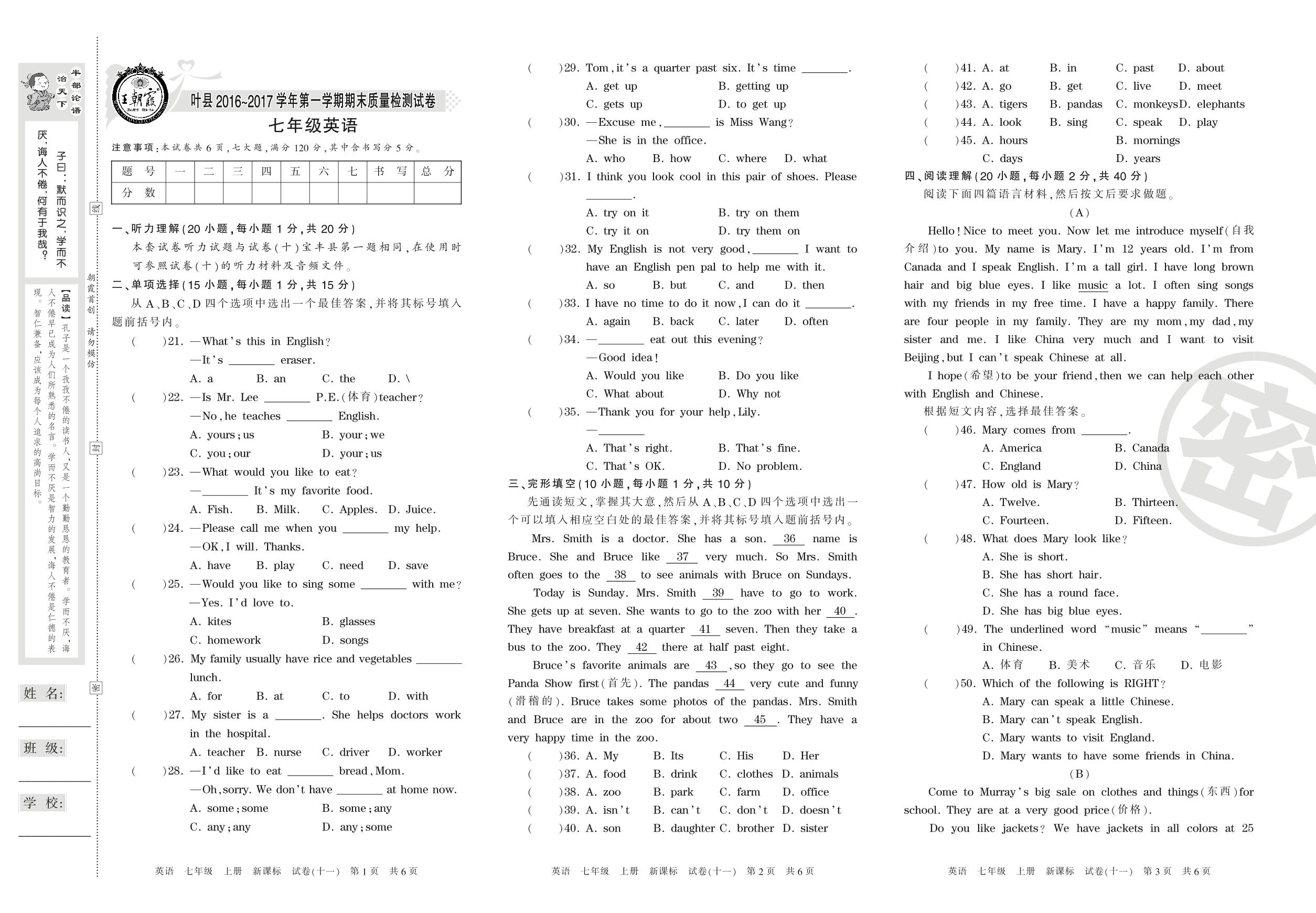 2016-2017学年第一学期平顶山市叶县七年级英语试卷(新课版)【11】