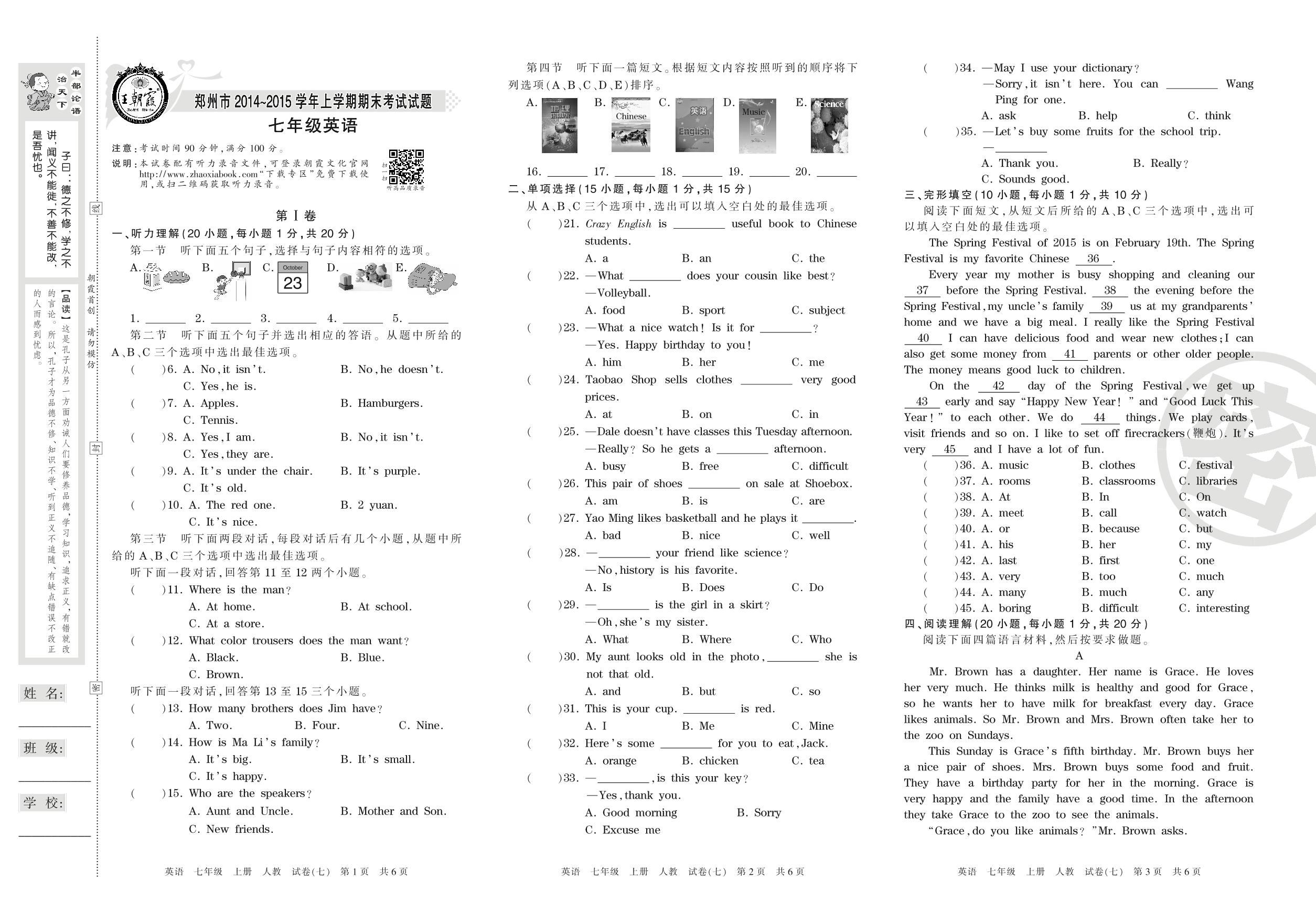 2014-2015学年第一学期郑州市七年级英语试卷(人教版)【7】