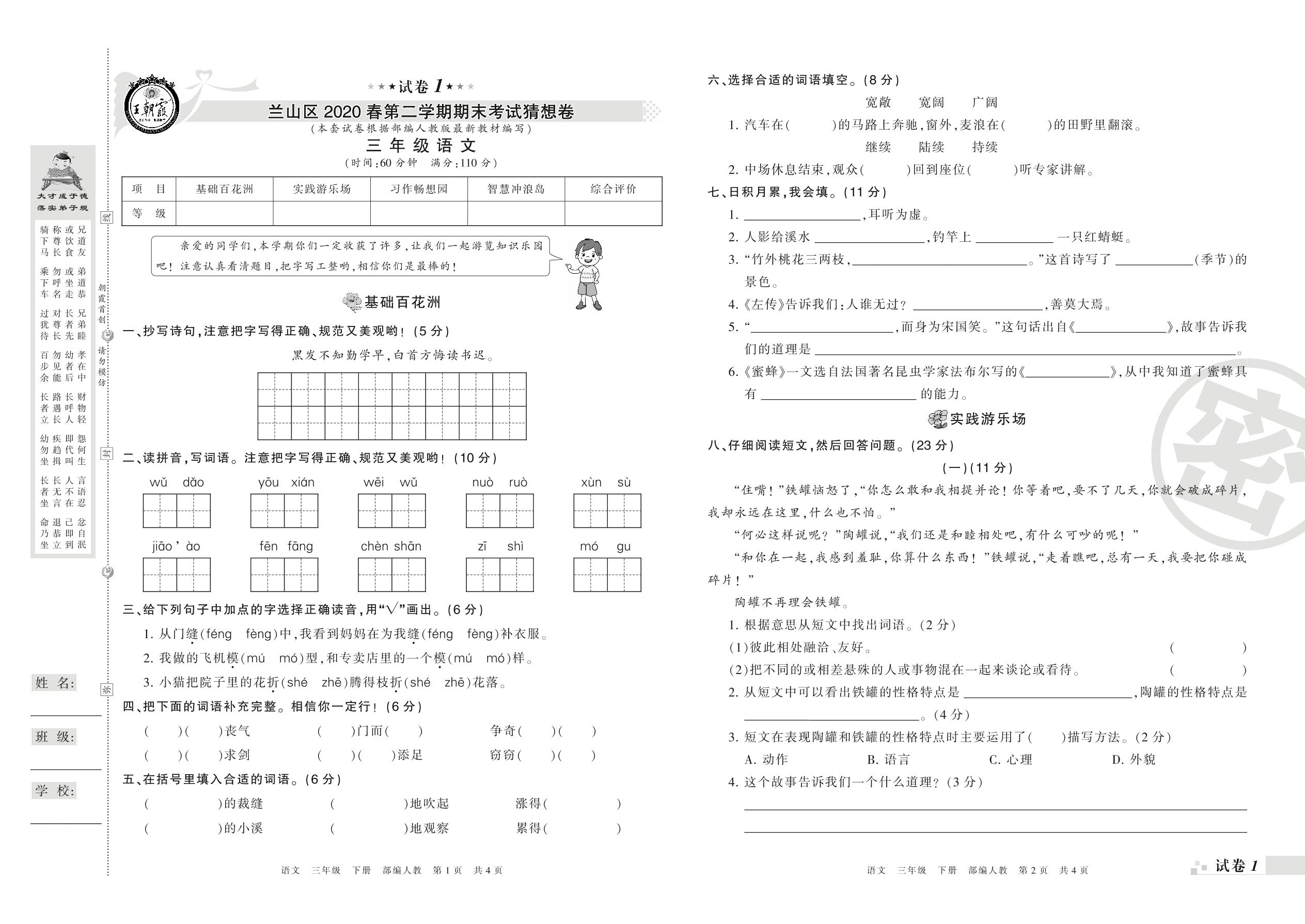 三年级语文人教版下册期末卷