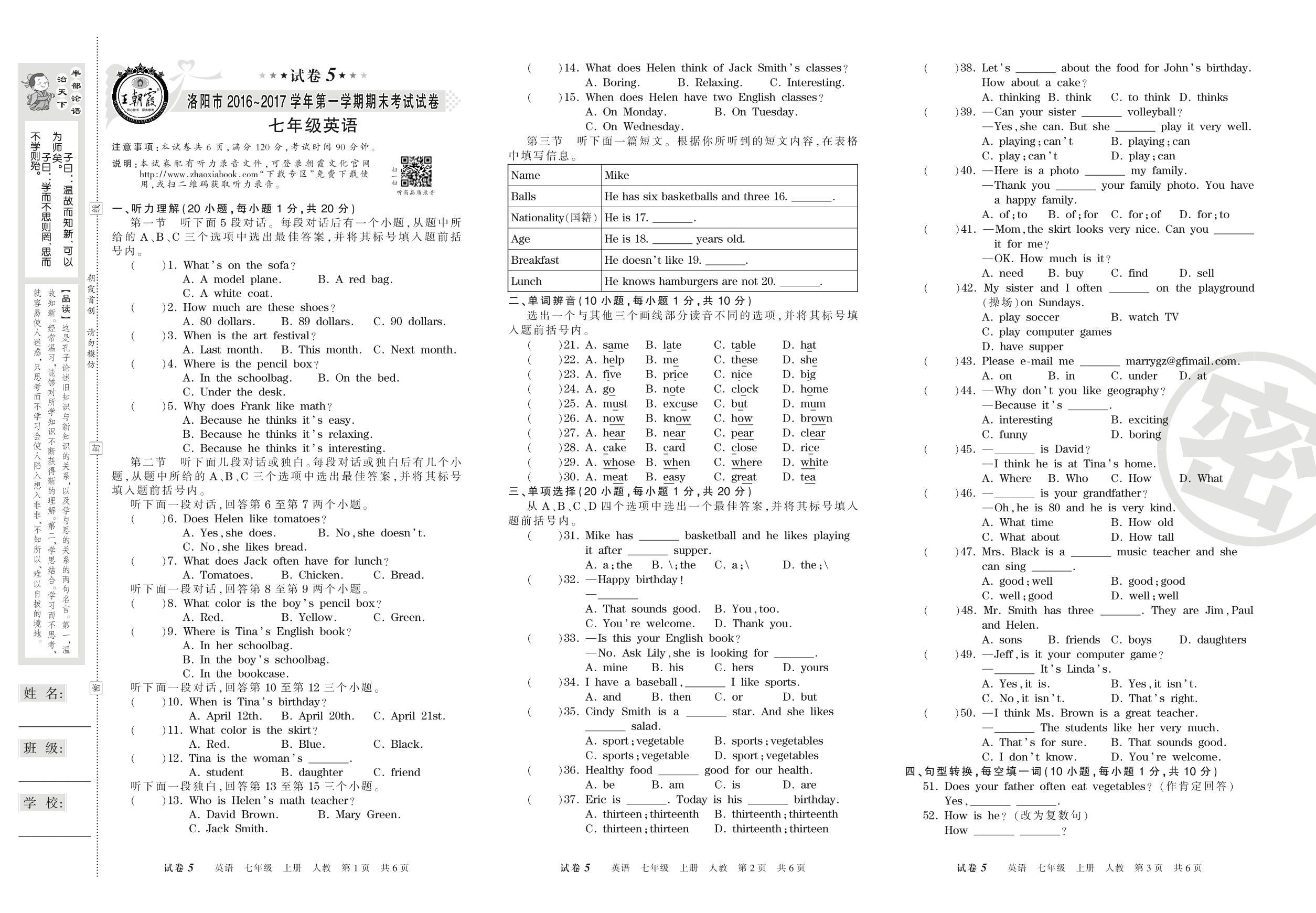 2016-2017学年第一学期洛阳市七年级英语试卷(人教版)【5】