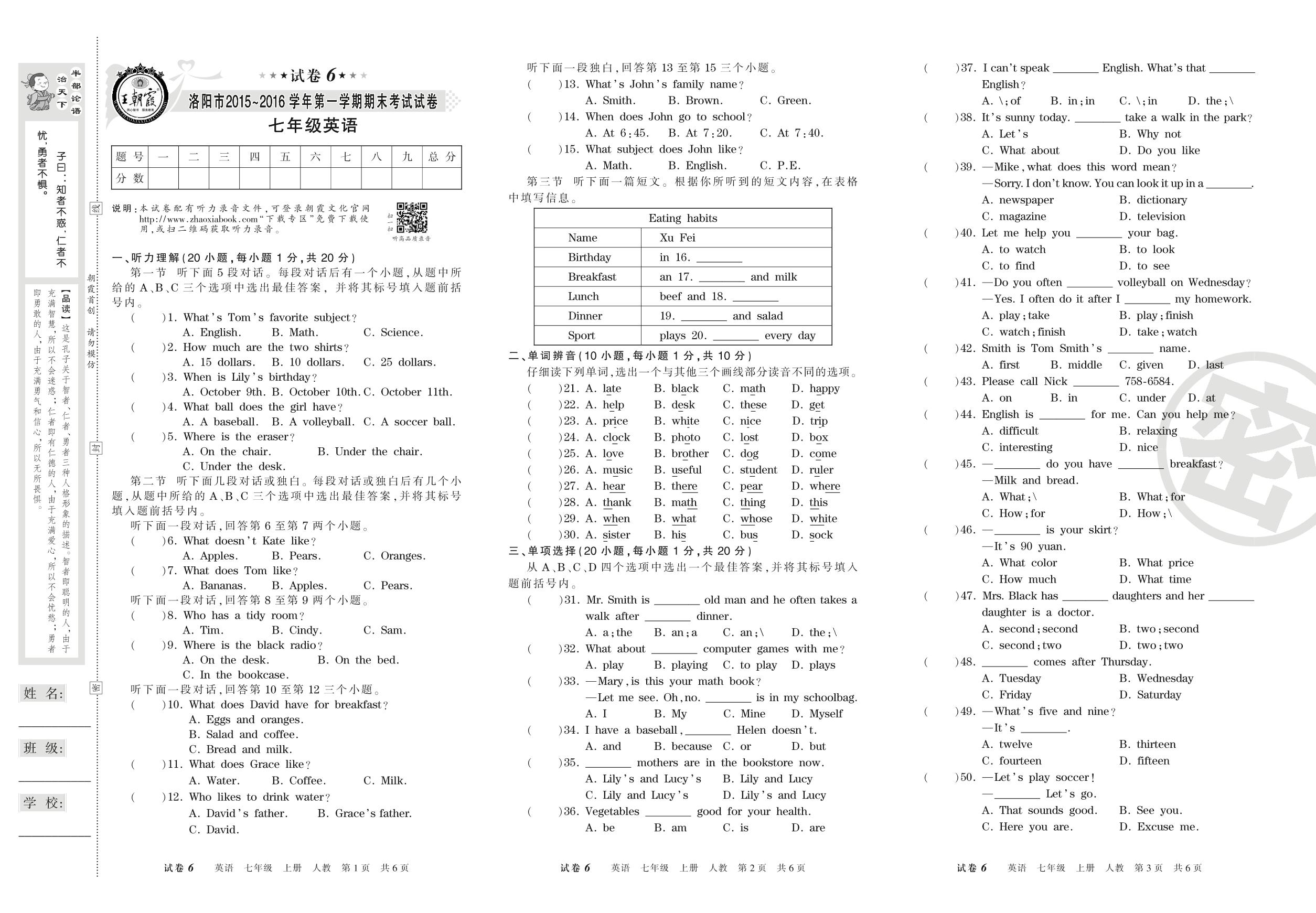 2015-2016学年第一学期洛阳市七年级英语试卷(人教版)【6】