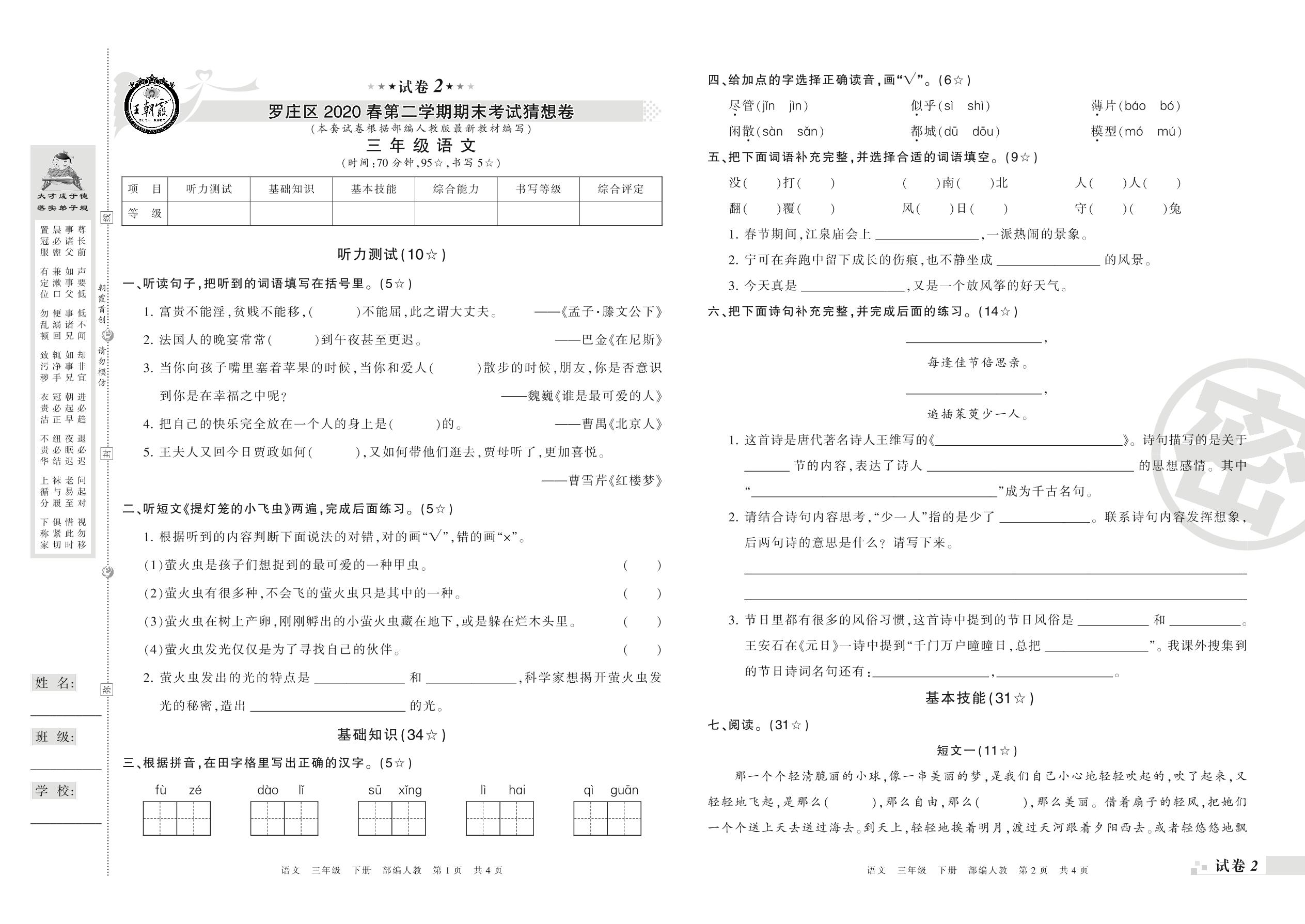 三年级语文人教版下册期末卷