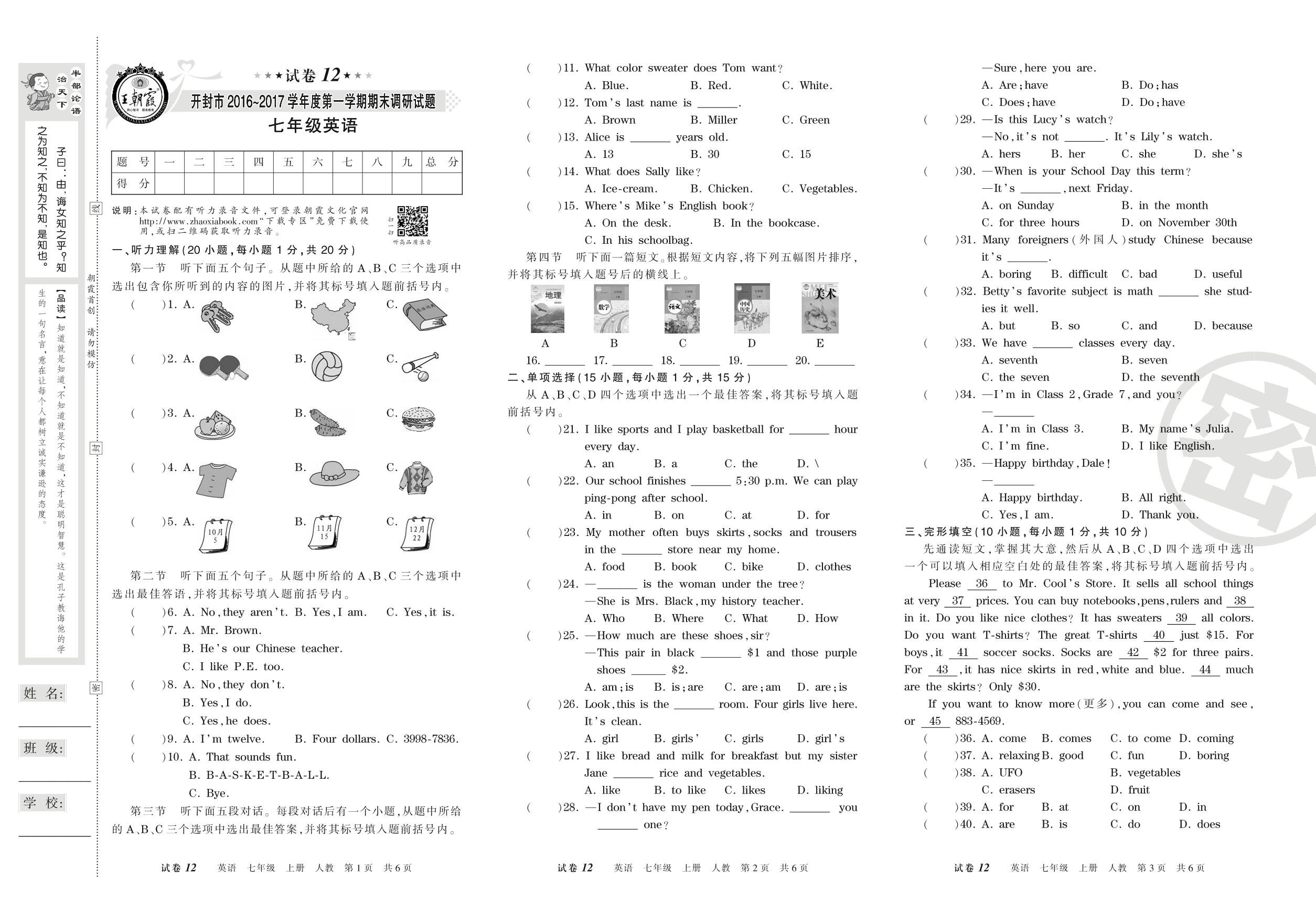 2016-2017学年第一学期开封市七年级英语试卷(人教版)【12】