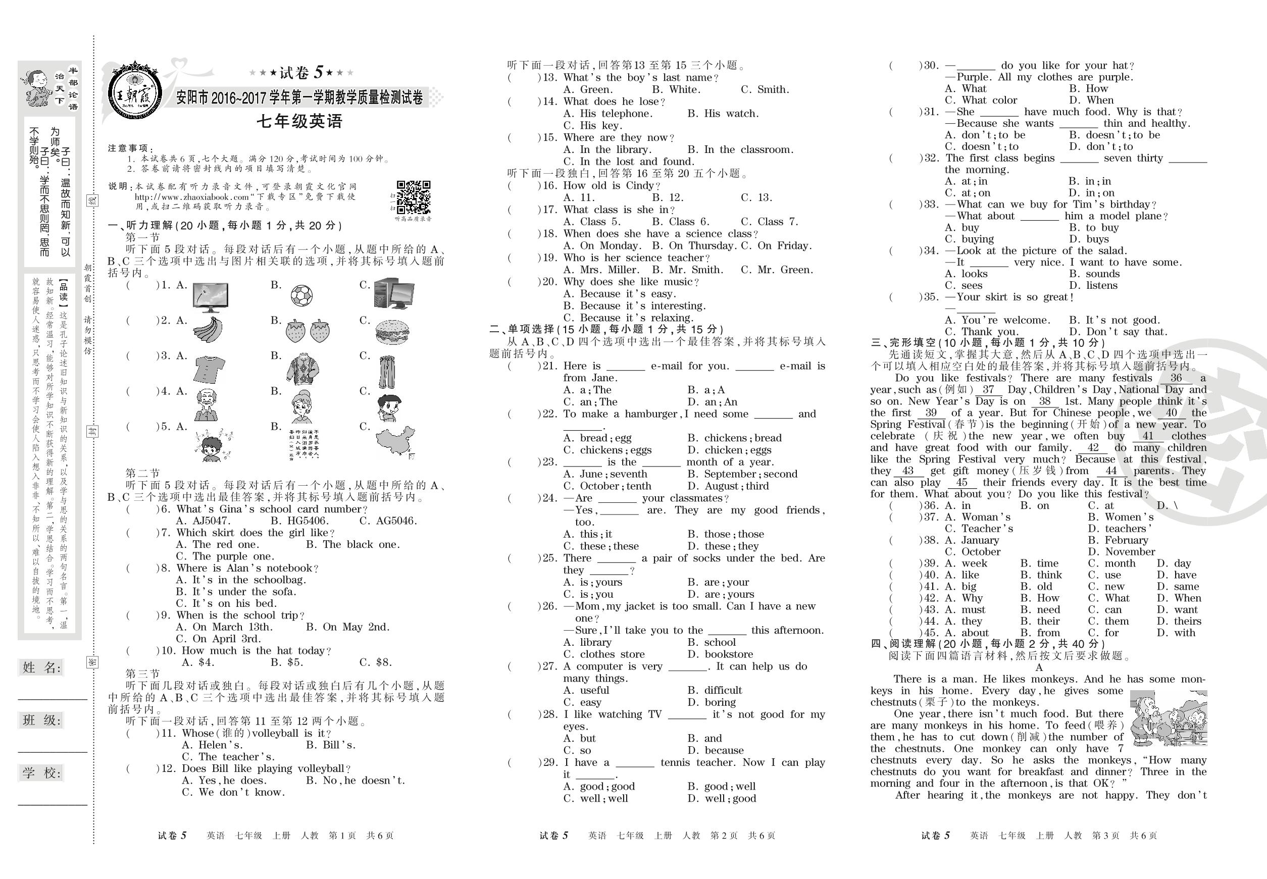 2016-2017学年第一学期安阳市七年级英语试卷(人教版)【5】