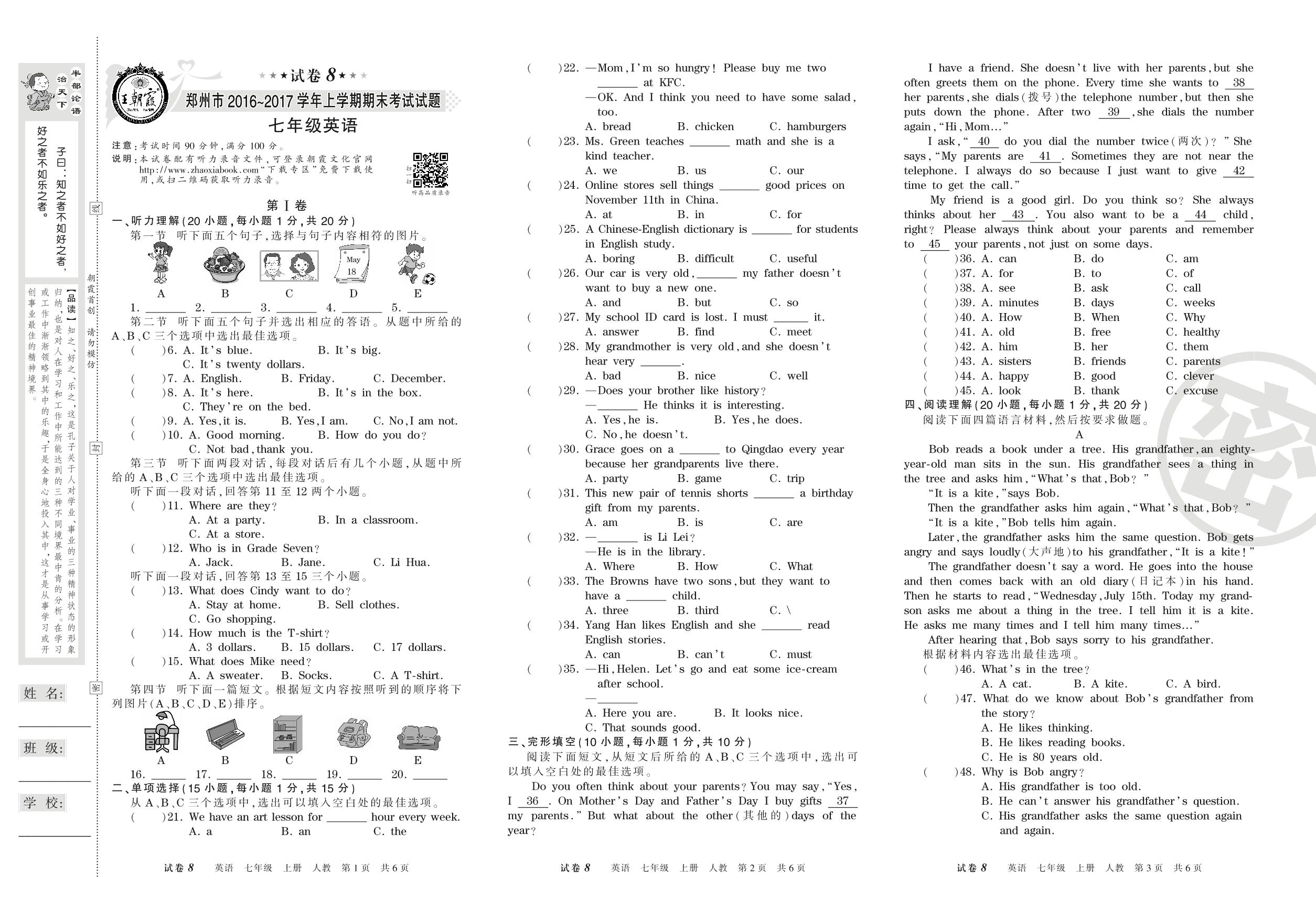 2016-2017学年第一学期郑州市七年级英语试卷(人教版)_R210807213243【8】
