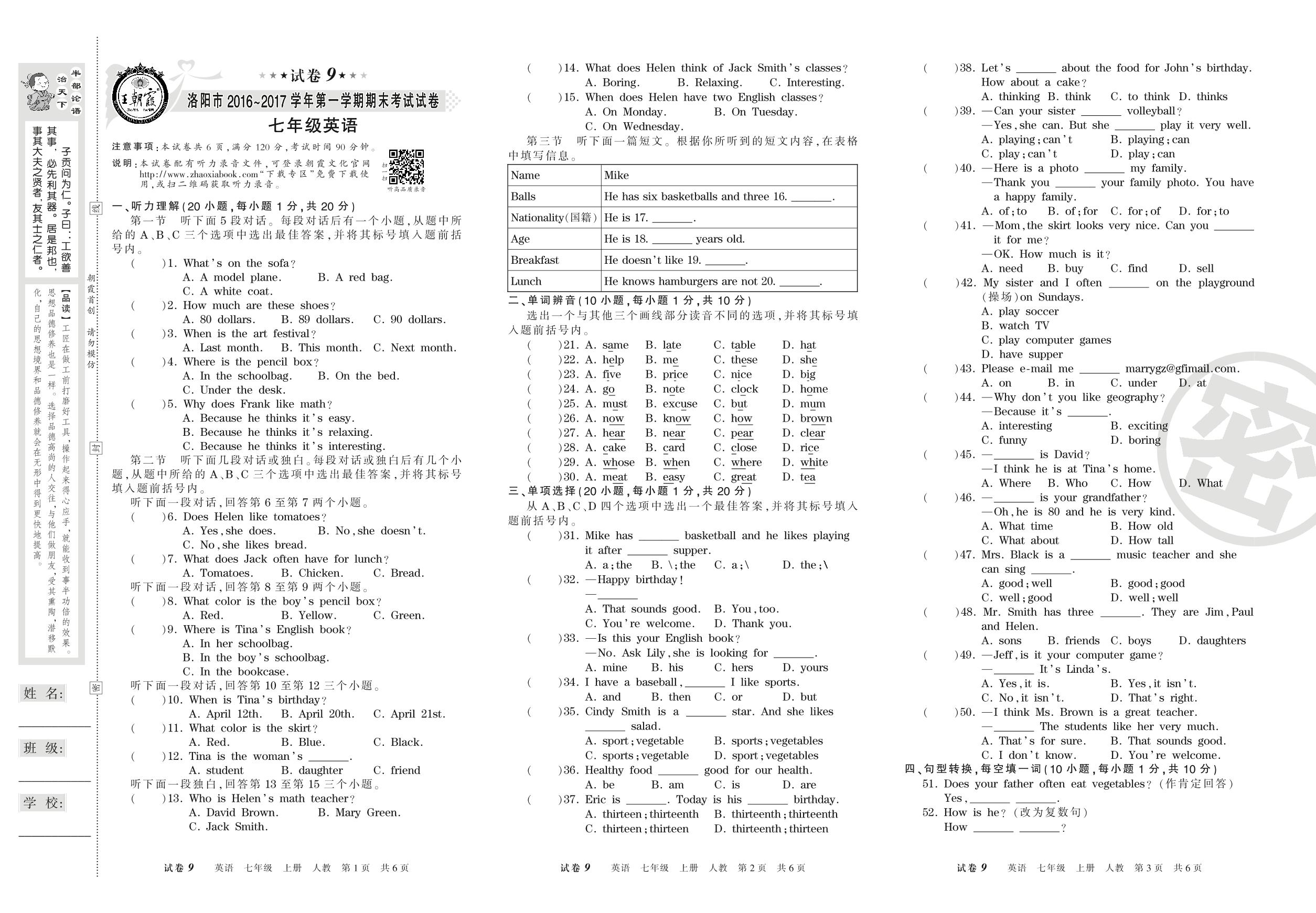 2016-2017学年第一学期洛阳市七年级英语试卷(人教版)_R210807213257【9】