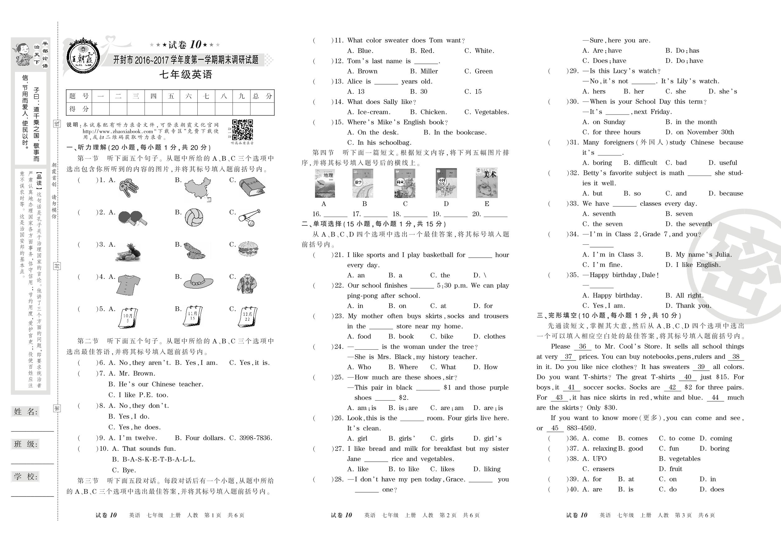 2016-2017学年第一学期开封市七年级英语试卷(人教版)【10】