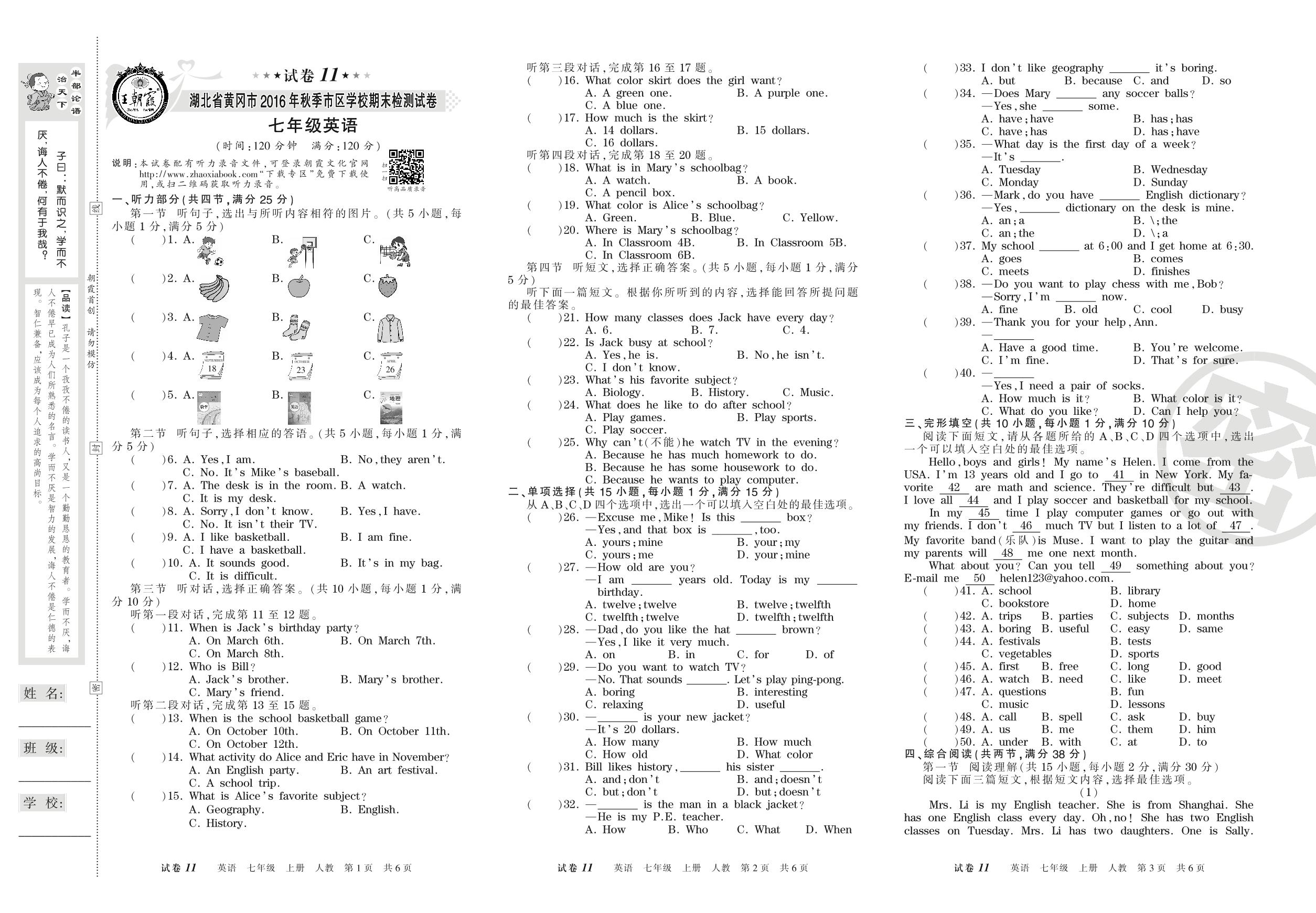 2016-2017学年第一学期湖北省黄冈市七年级英语试卷(人教版)【11】