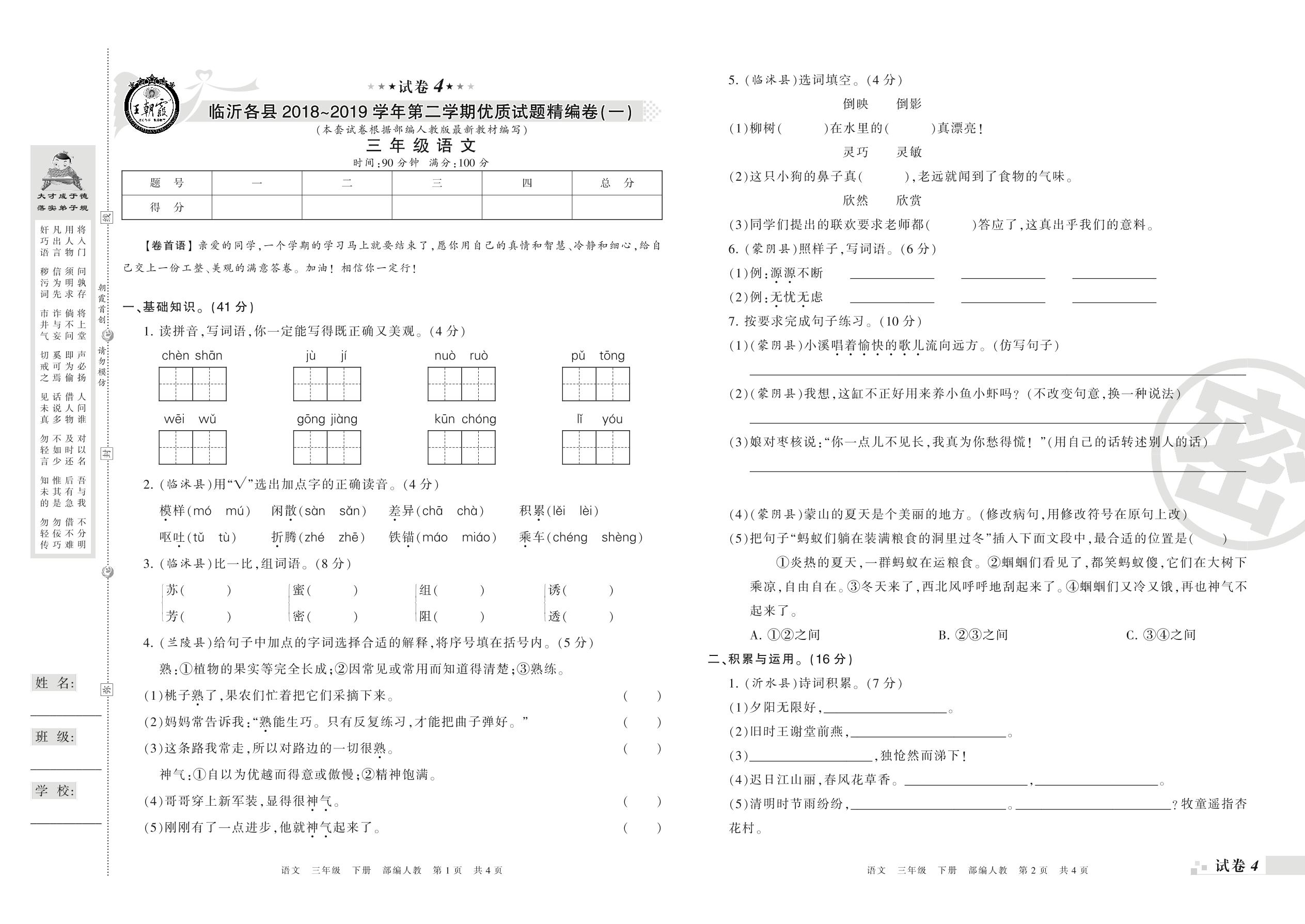 临沂各县优质试题精编卷(一)三年级下册语文(人教版)【4】