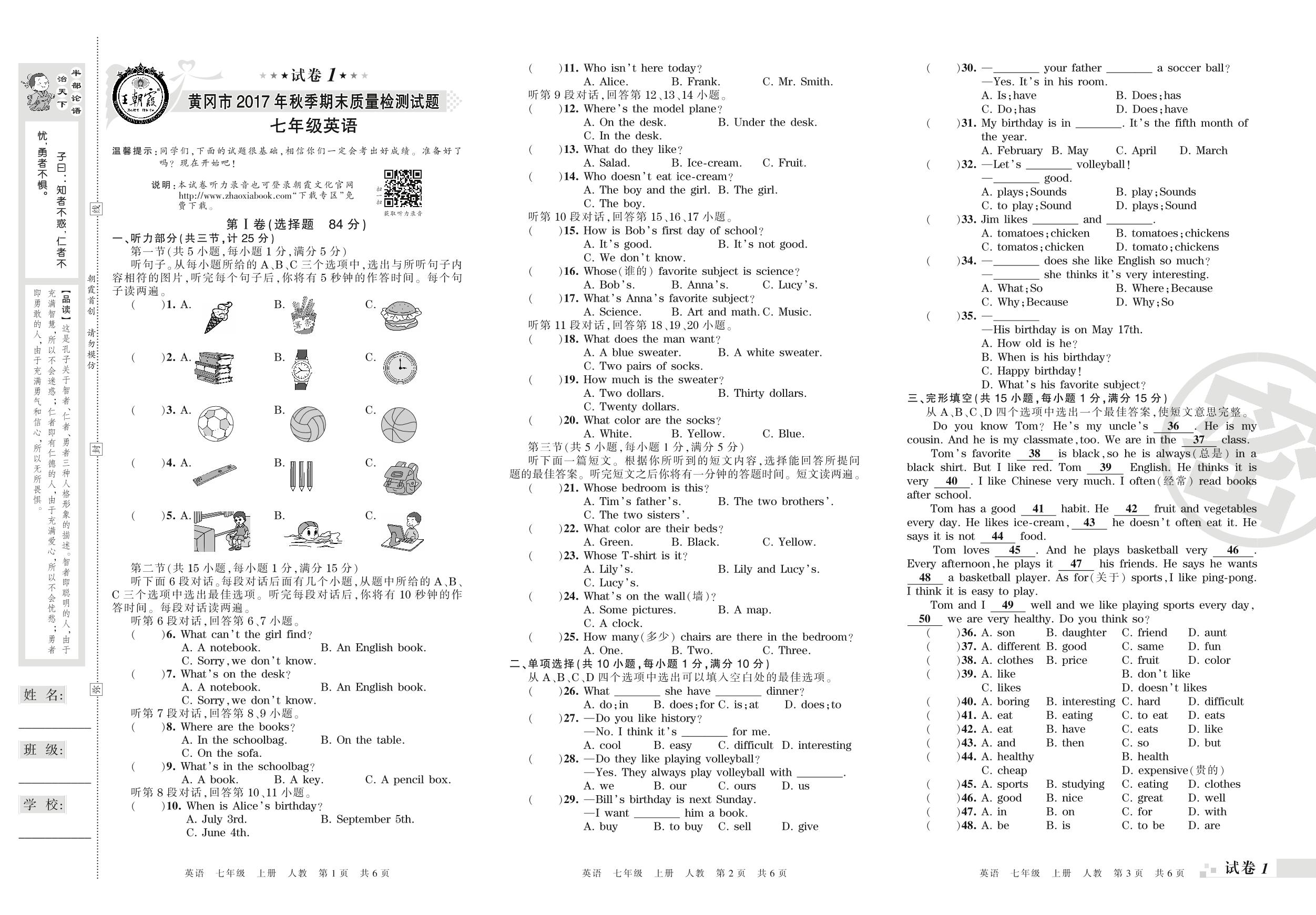 2017-2018学年第一学期黄冈市七年级英语试卷(人教版)【1】