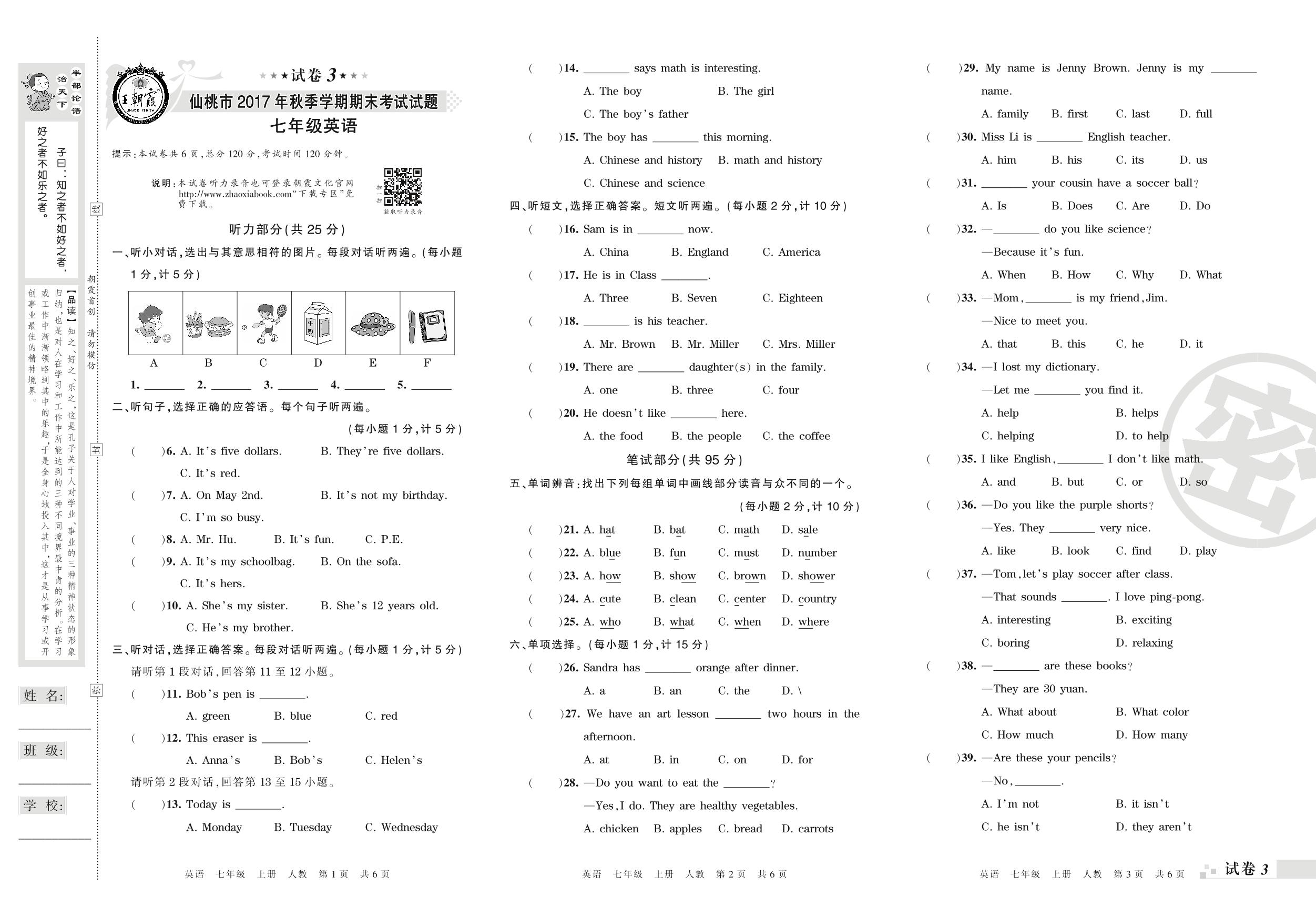 2017-2018学年第一学期仙桃市七年级英语试卷(人教版)【3】