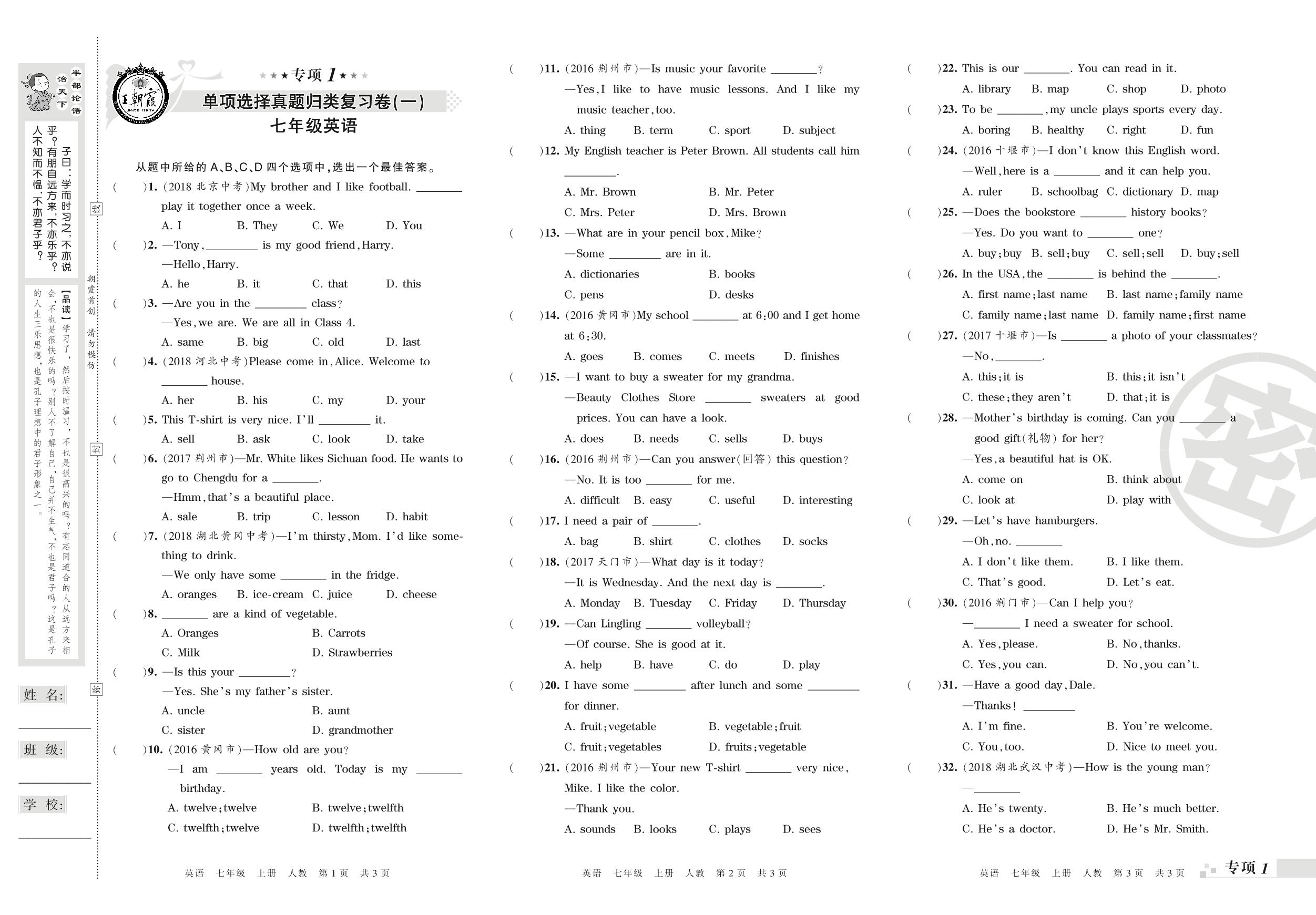 王朝霞期末专项卷——单项选择真题归类复习七年级上册英语(人教版)_R210807213523【0】