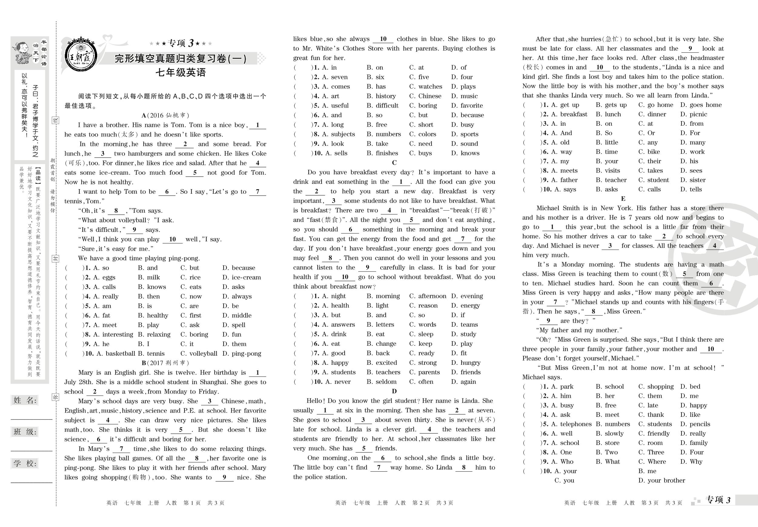王朝霞期末专项卷——完形填空真题归类复习七年级上册英语(人教版)_R210807213528【0】