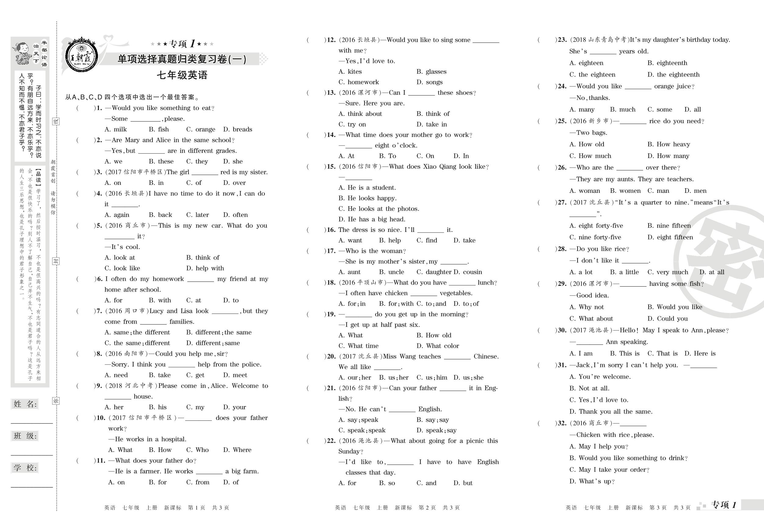 王朝霞期末专项卷——单项选择真题归类复习七年级上册英语(新课版)_R210807213553【0】