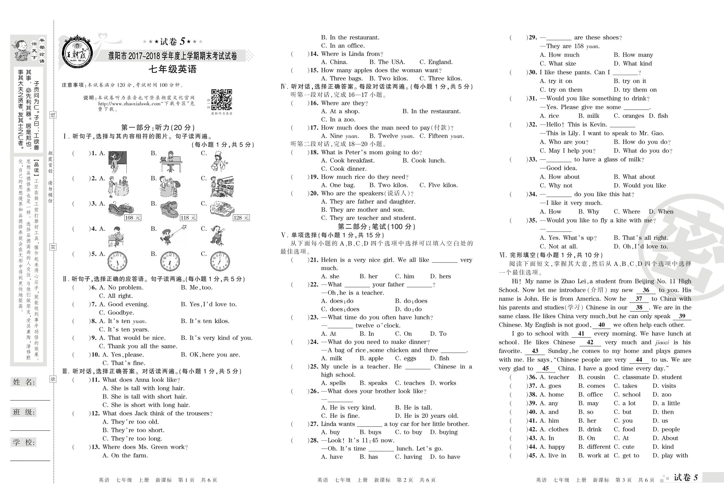 2017-2018学年第一学期濮阳市七年级英语试卷(新课版)【5】