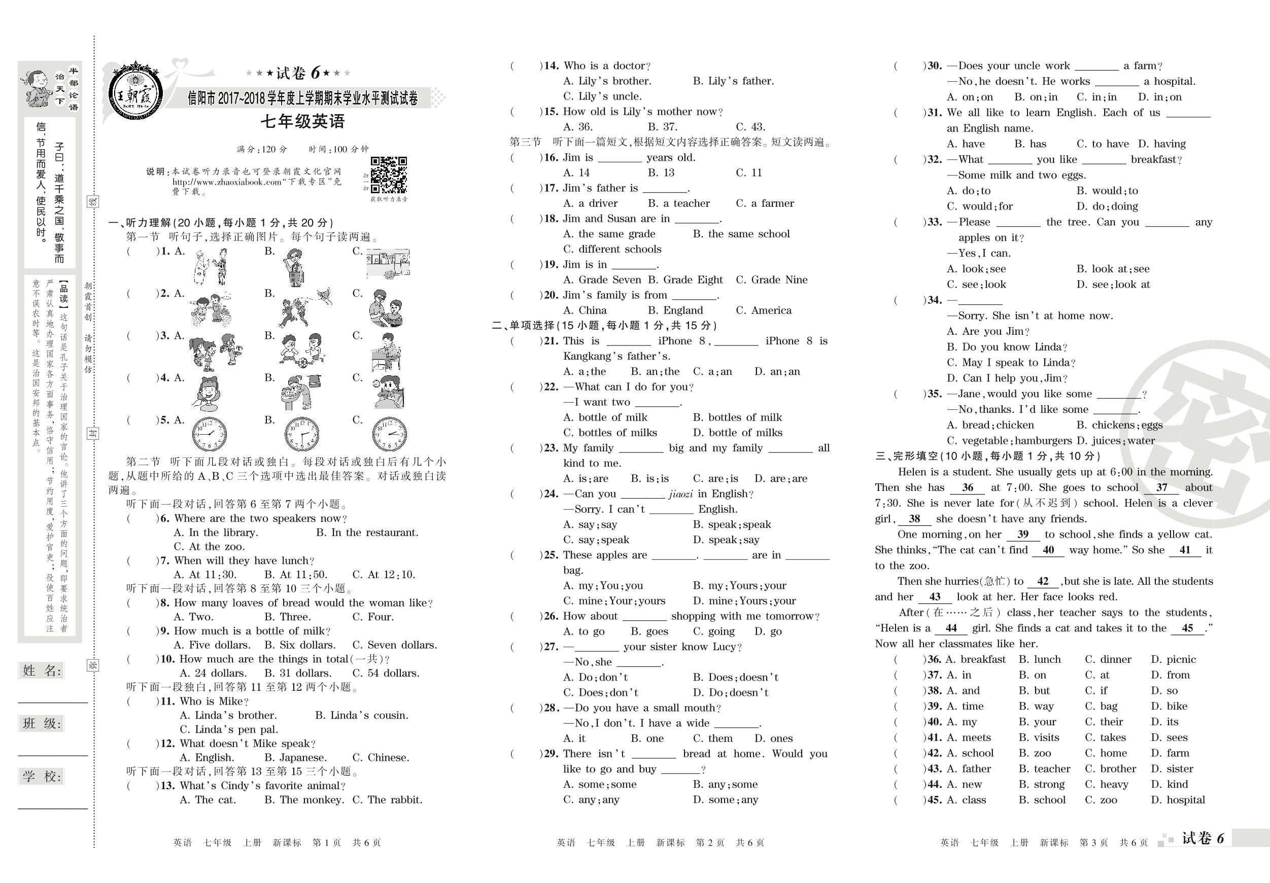 2017-2018学年第一学期信阳市七年级英语试卷(新课版)【6】