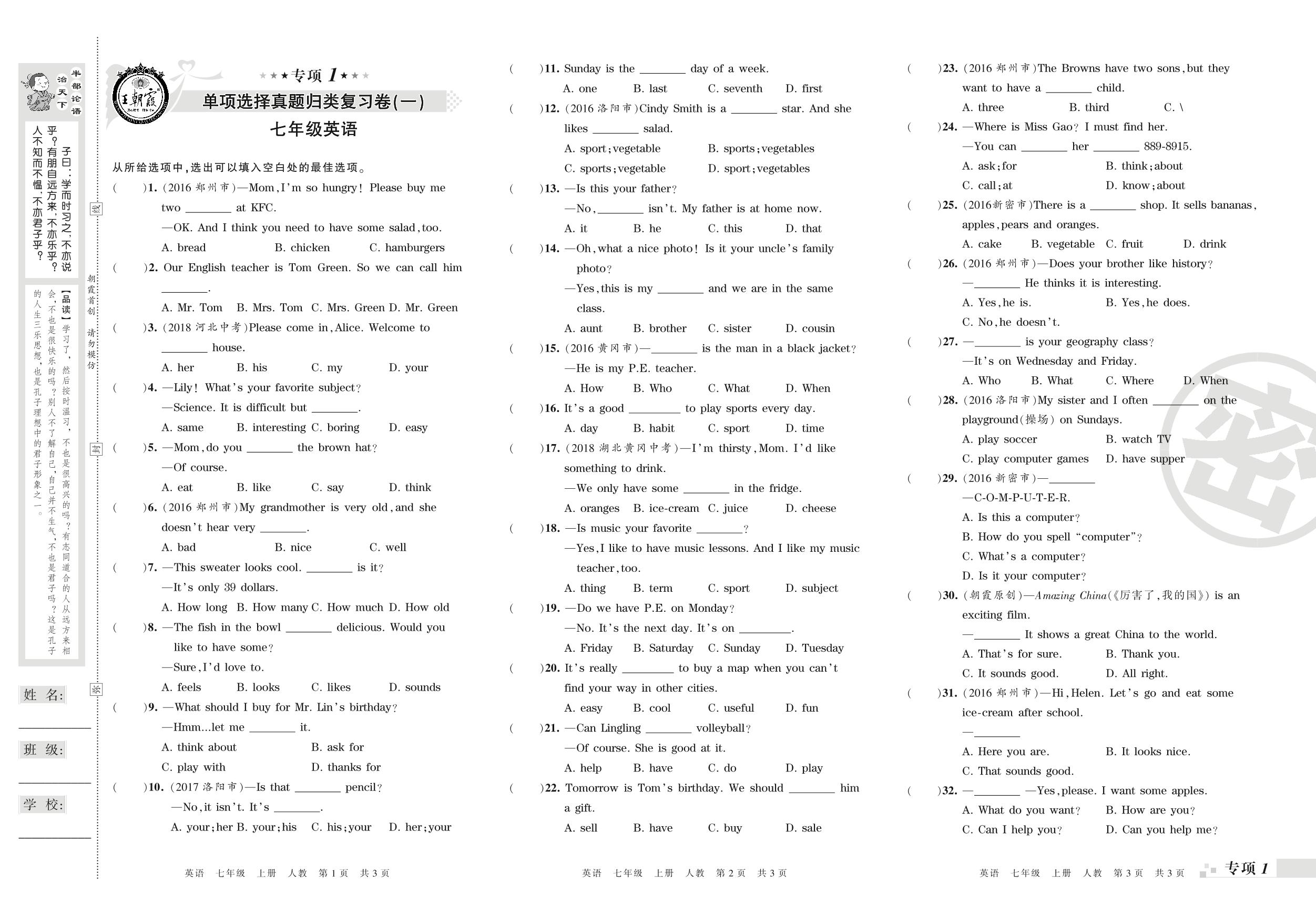 王朝霞期末专项卷——单项选择真题归类复习七年级上册英语(人教版)_R210807213918【0】