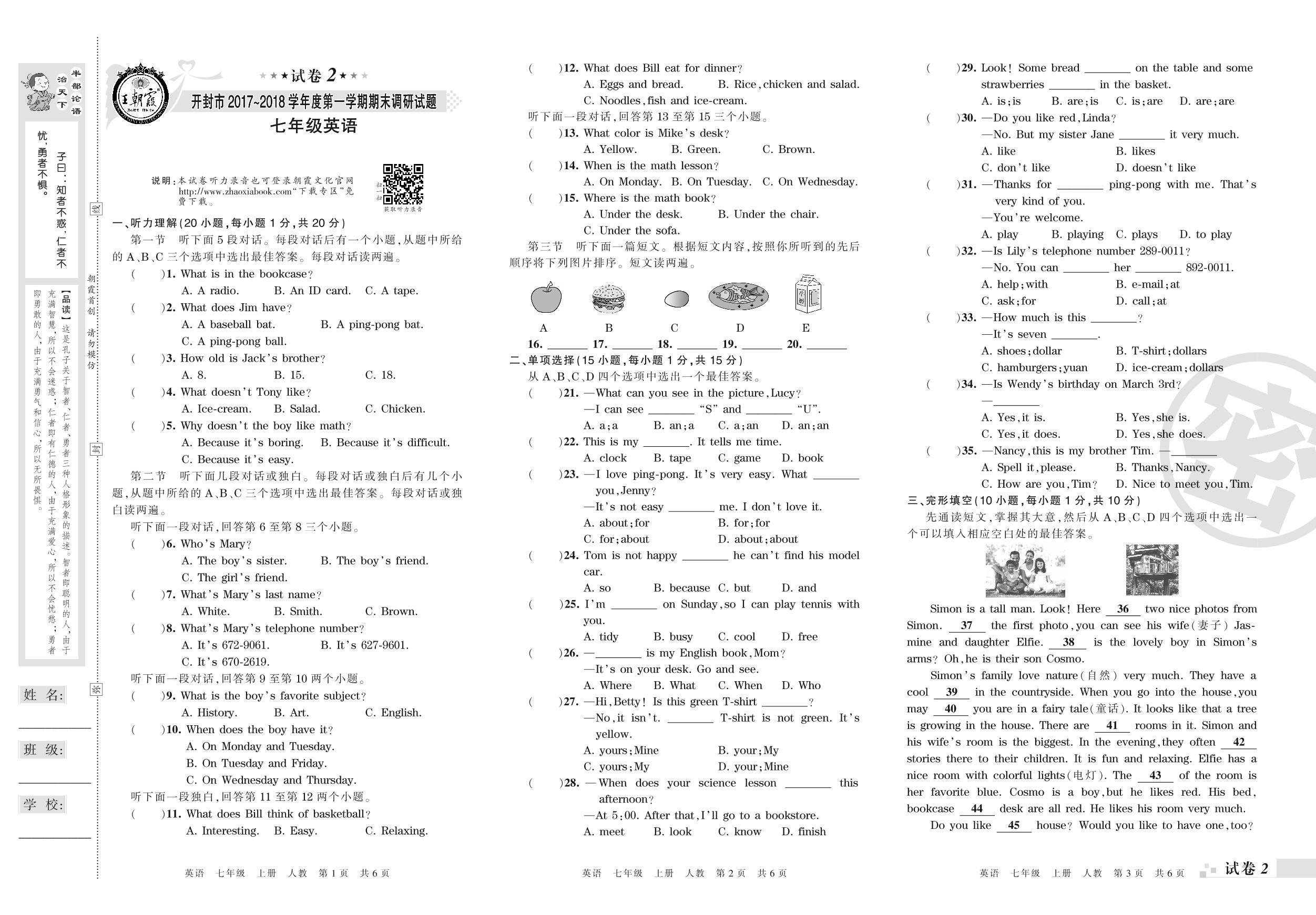 2017-2018学年第一学期开封市七年级英语试卷(人教版)【2】