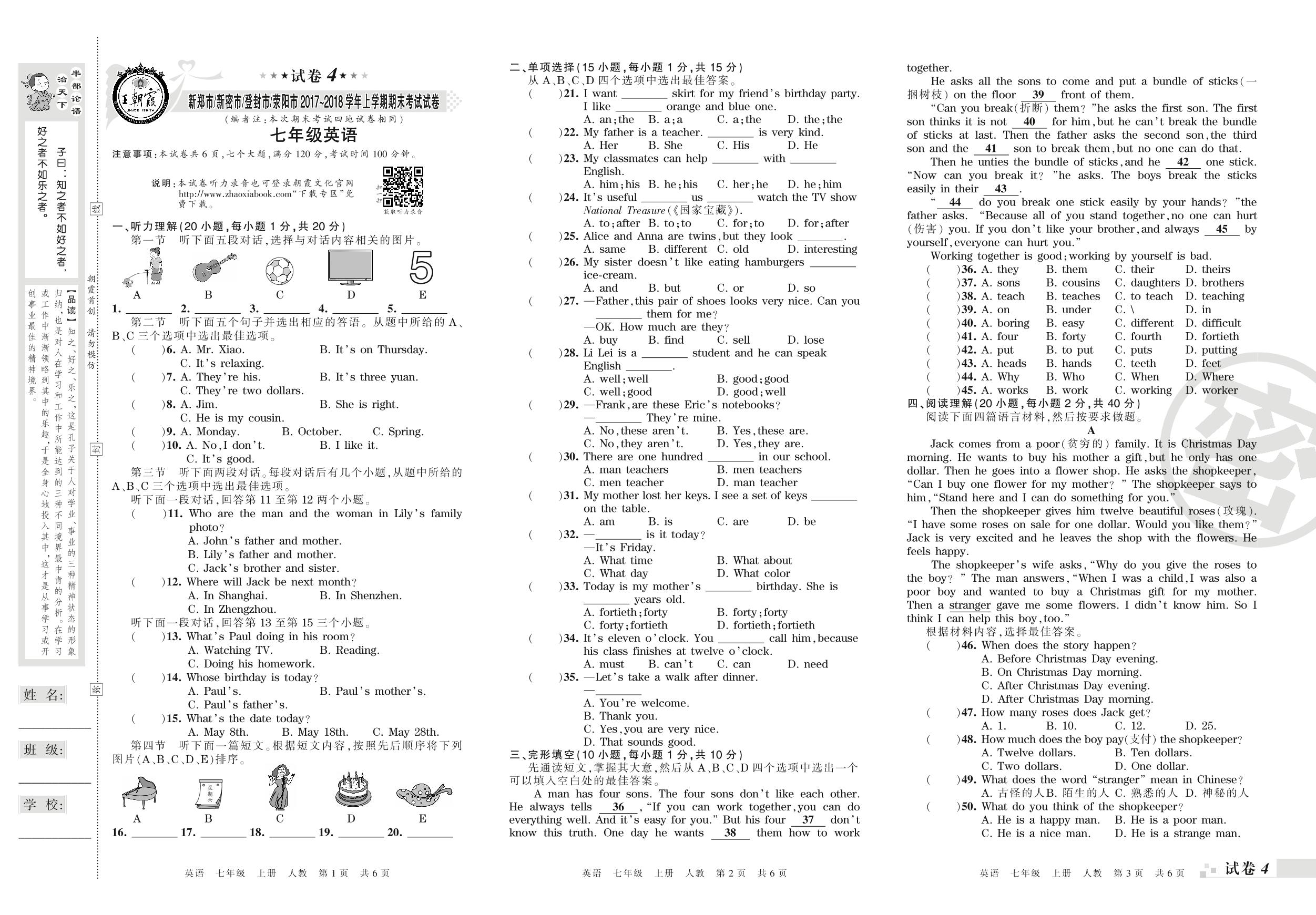 2017-2018学年第一学期新郑市新密市登封市荥阳市七年级英语试卷(人教版)【4】