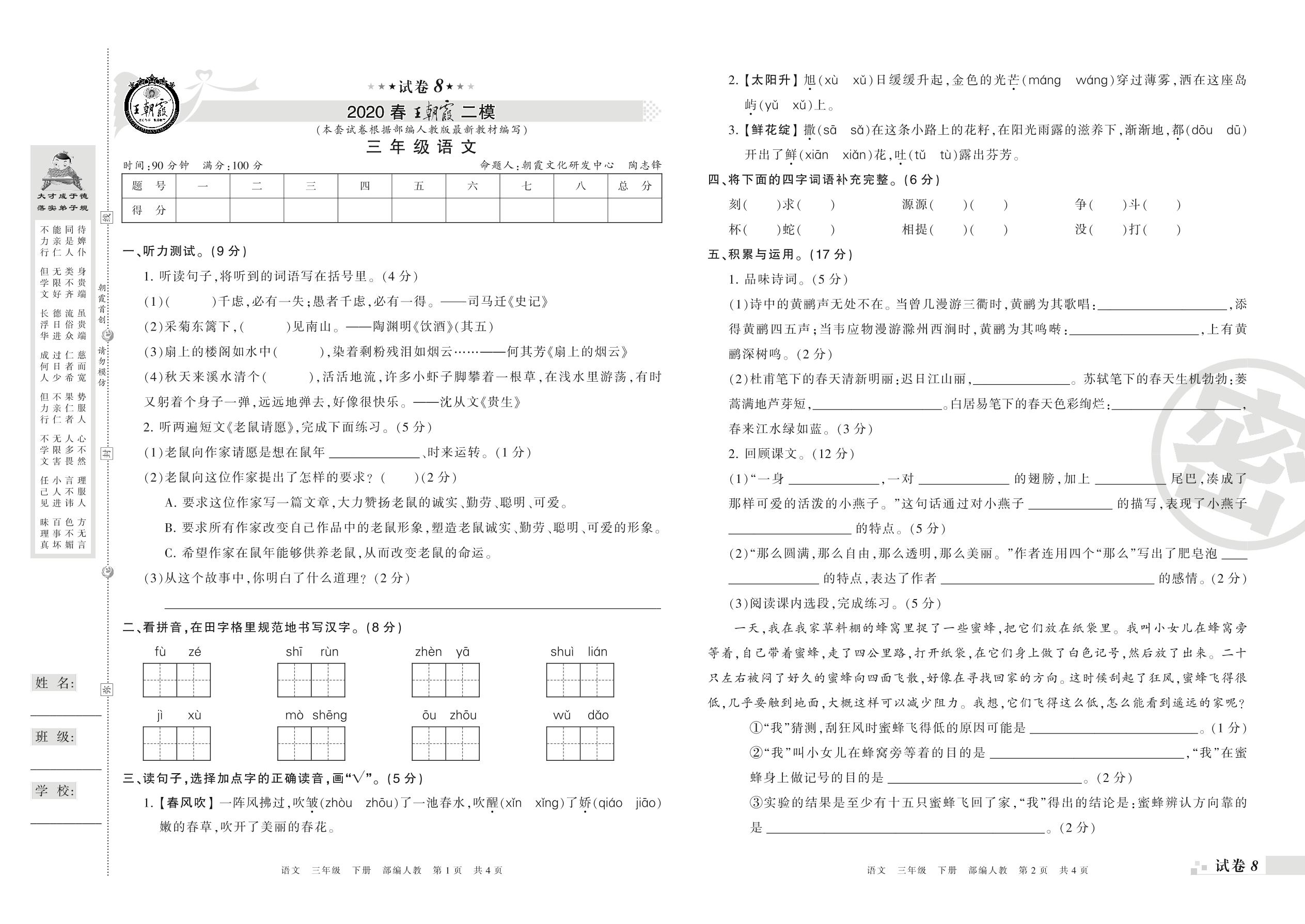 王朝霞期末模拟卷三年级下册语文(人教版)_R21080190450【8】