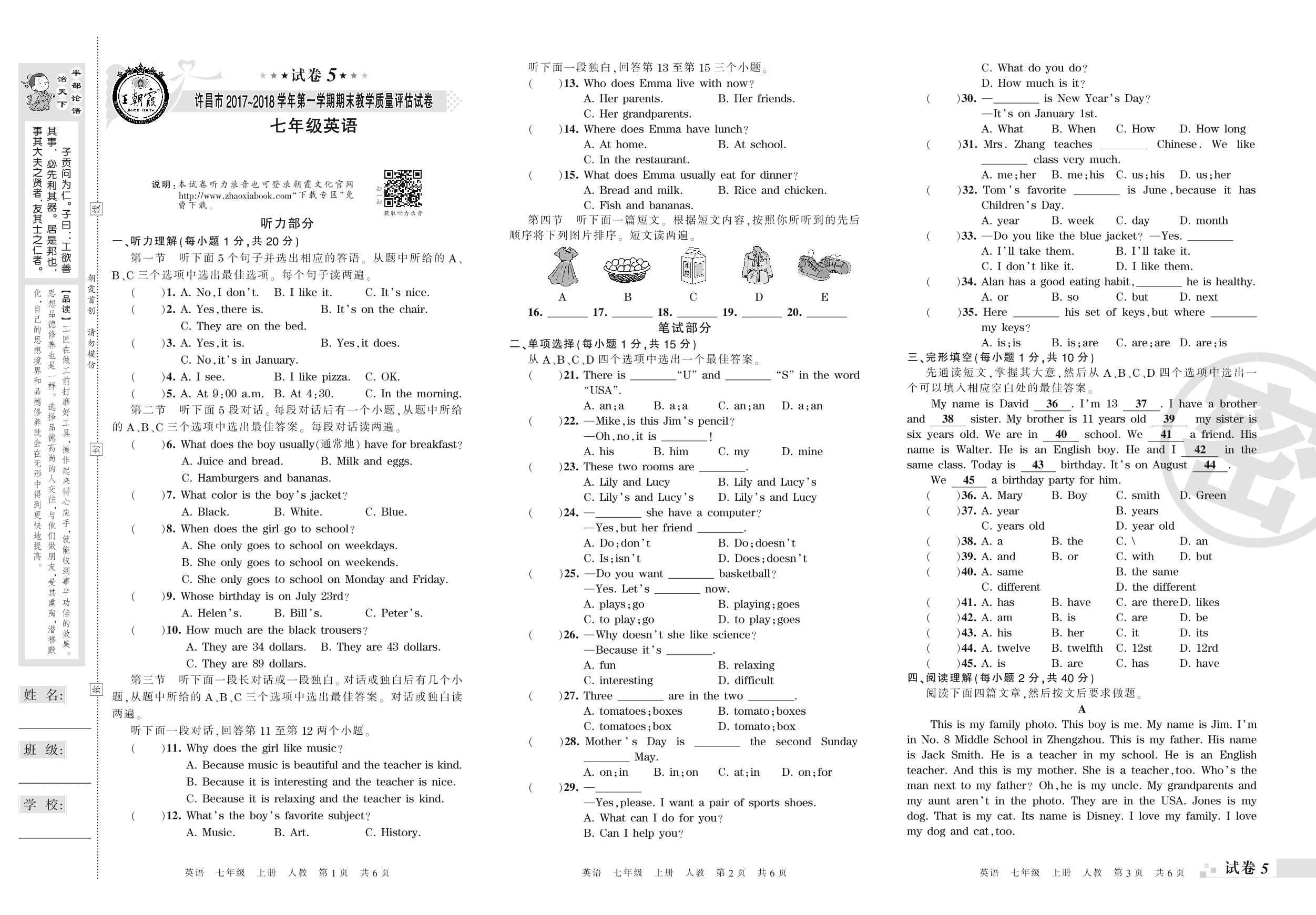 2017-2018学年第一学期许昌市七年级英语试卷(人教版)【5】