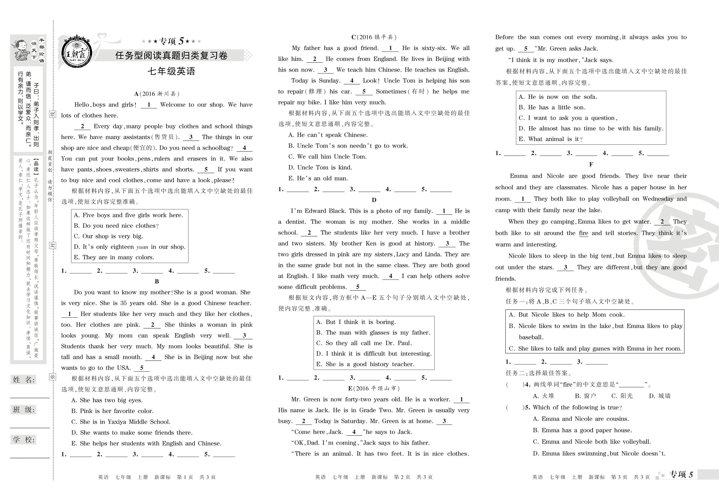 王朝霞期末专项卷——任务型阅读理解、词语运用真题归类复习七年级上册英语(新课版)【0】