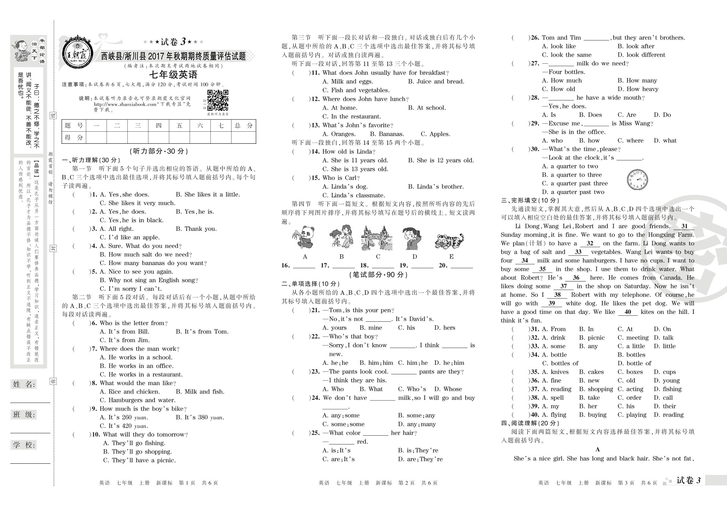 2017-2018学年第一学期南阳市西峡县(淅川县)七年级英语试卷(新课版)【3】