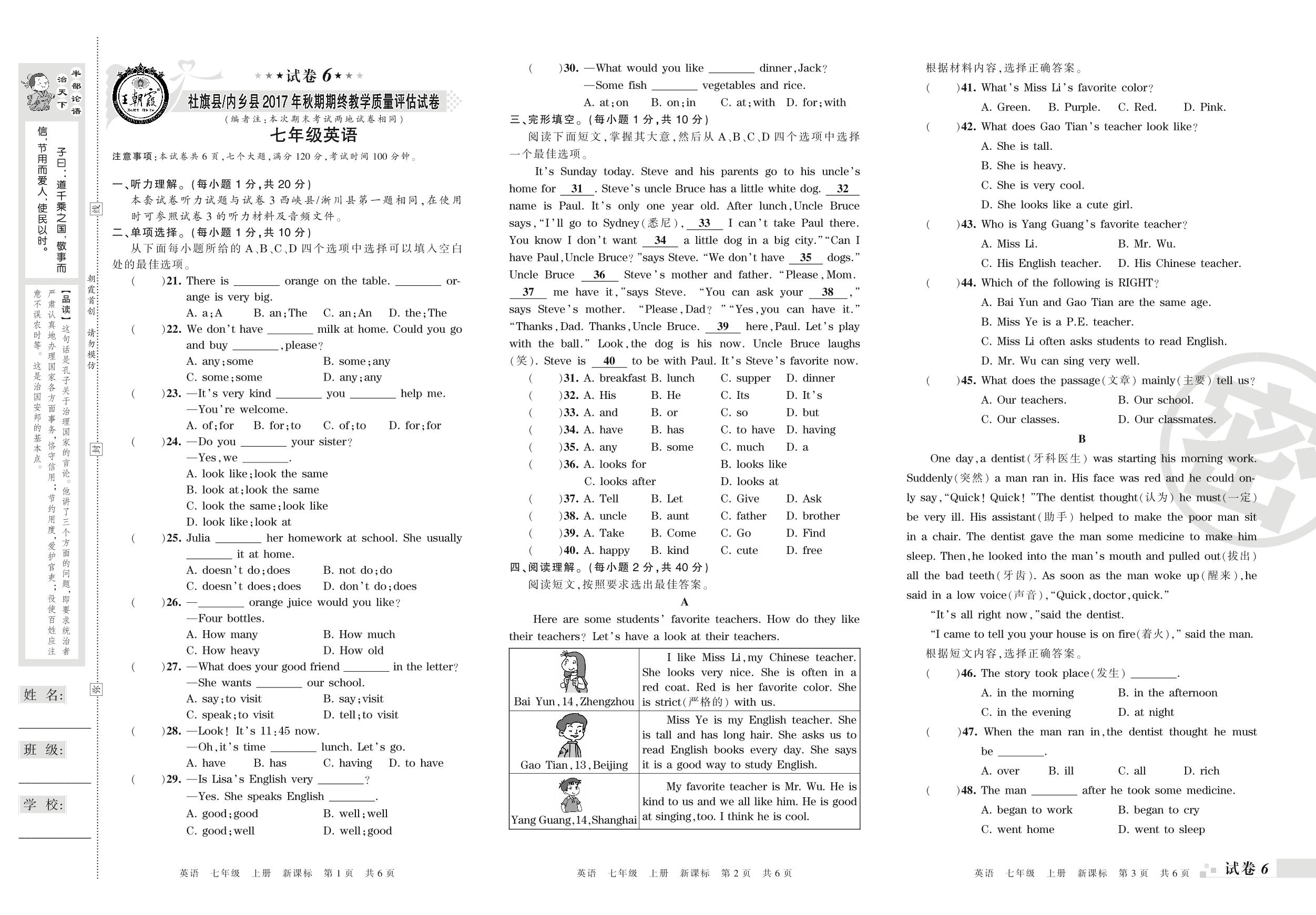 2017-2018学年第一学期南阳市社旗县(内乡县)七年级英语试卷(新课版)【6】