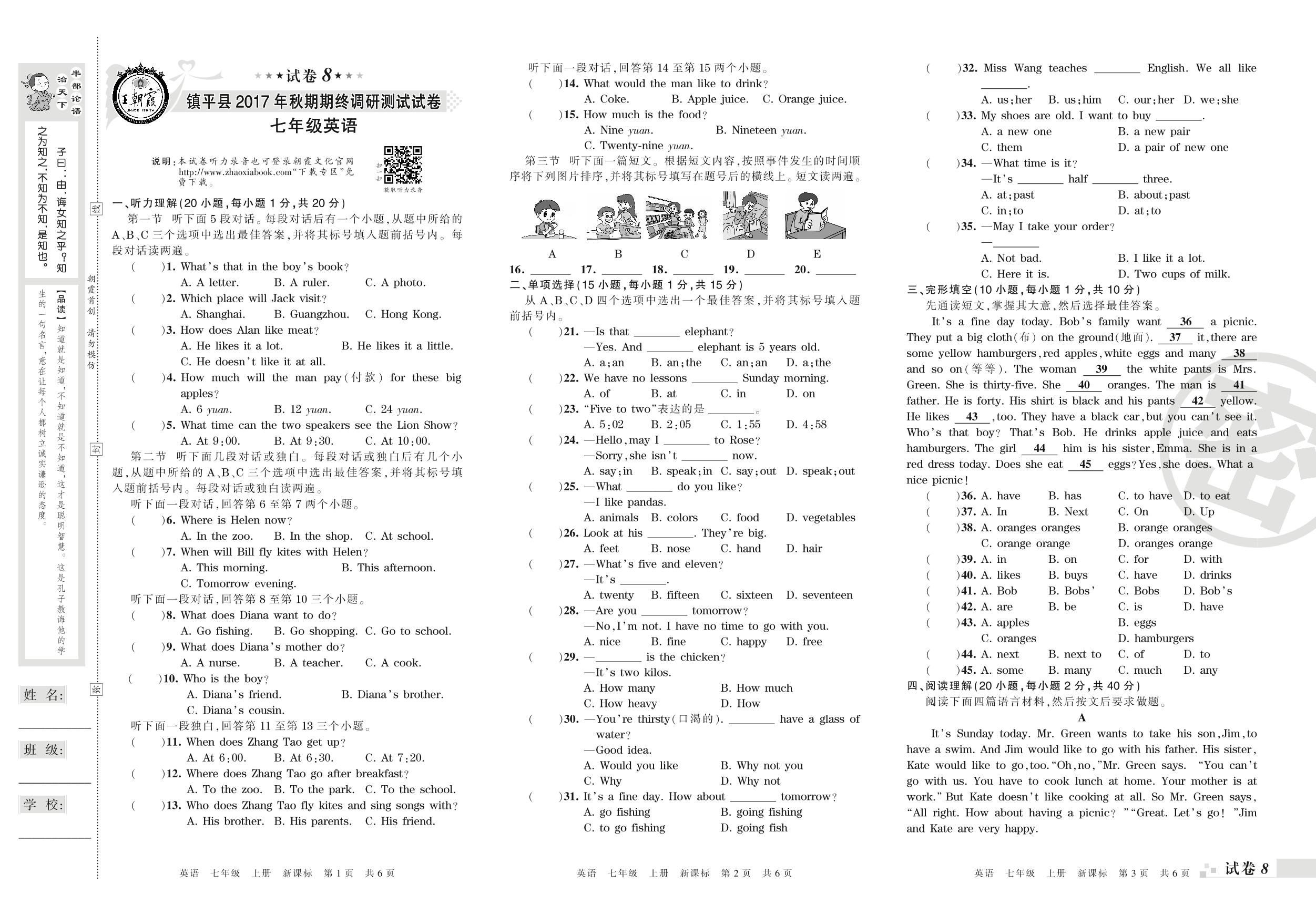 2017-2018学年第一学期南阳市镇平县七年级英语试卷(新课版)【8】