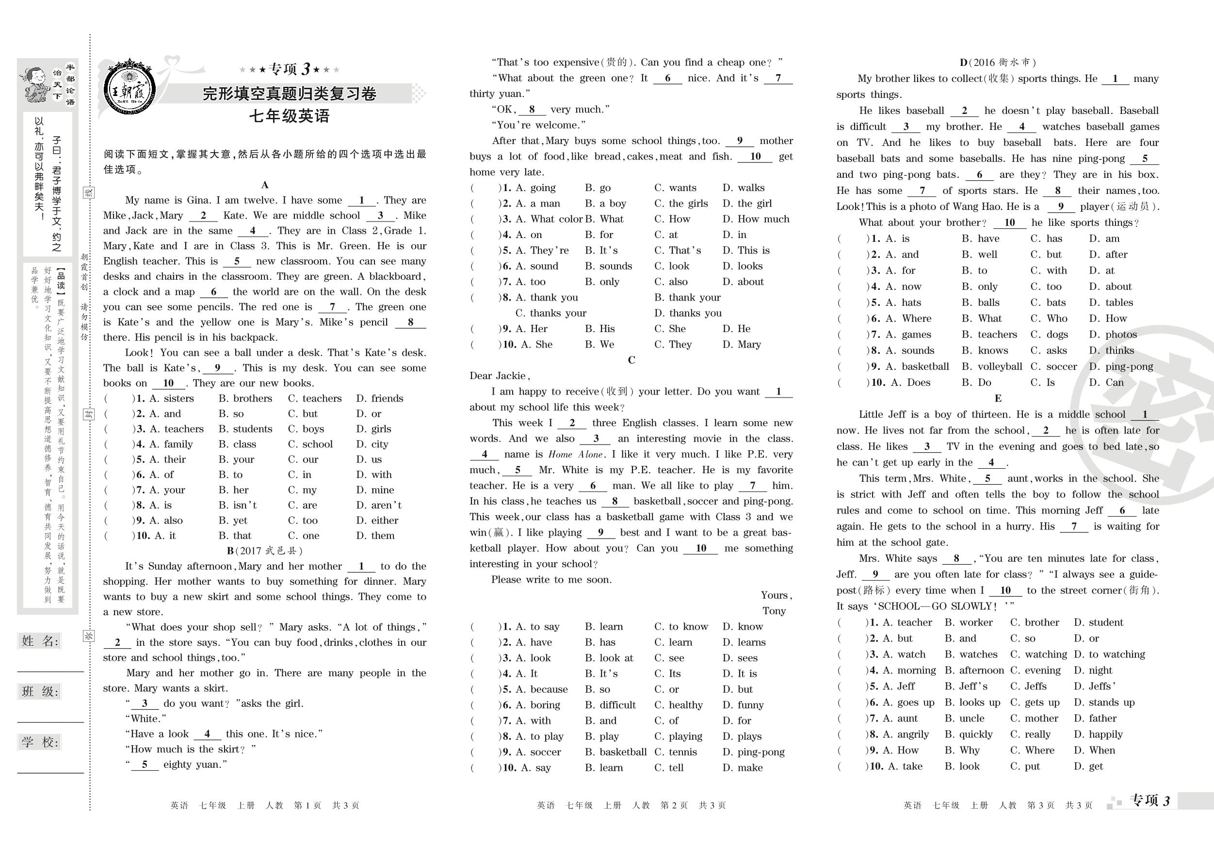 王朝霞期末专项卷——完形填空、阅读理解真题归类复习卷七年级上册英语(人教版)_R210807214508【0】