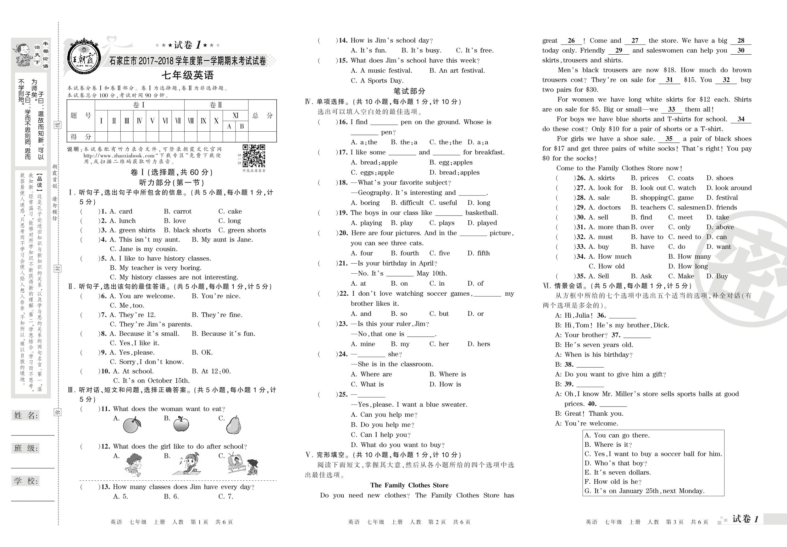 2017-2018学年第一学期石家庄市七年级英语试卷(人教版)【1】