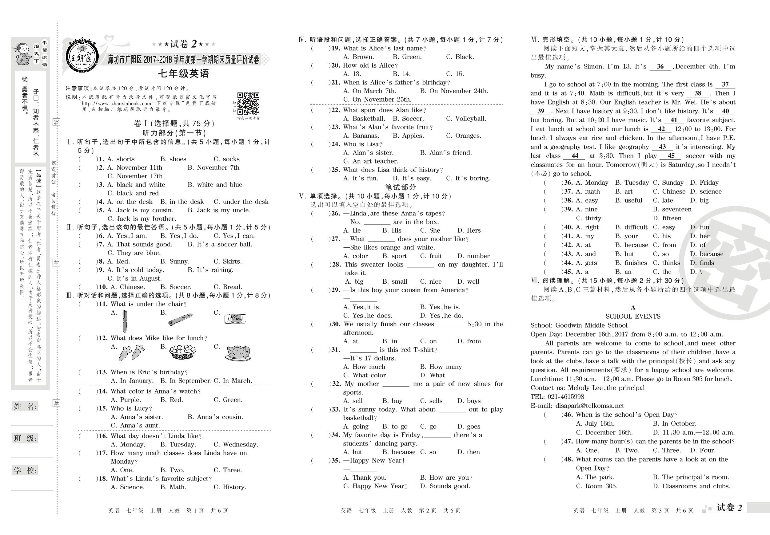 2017-2018学年第一学期廊坊市广阳区七年级英语试卷(人教版)【2】