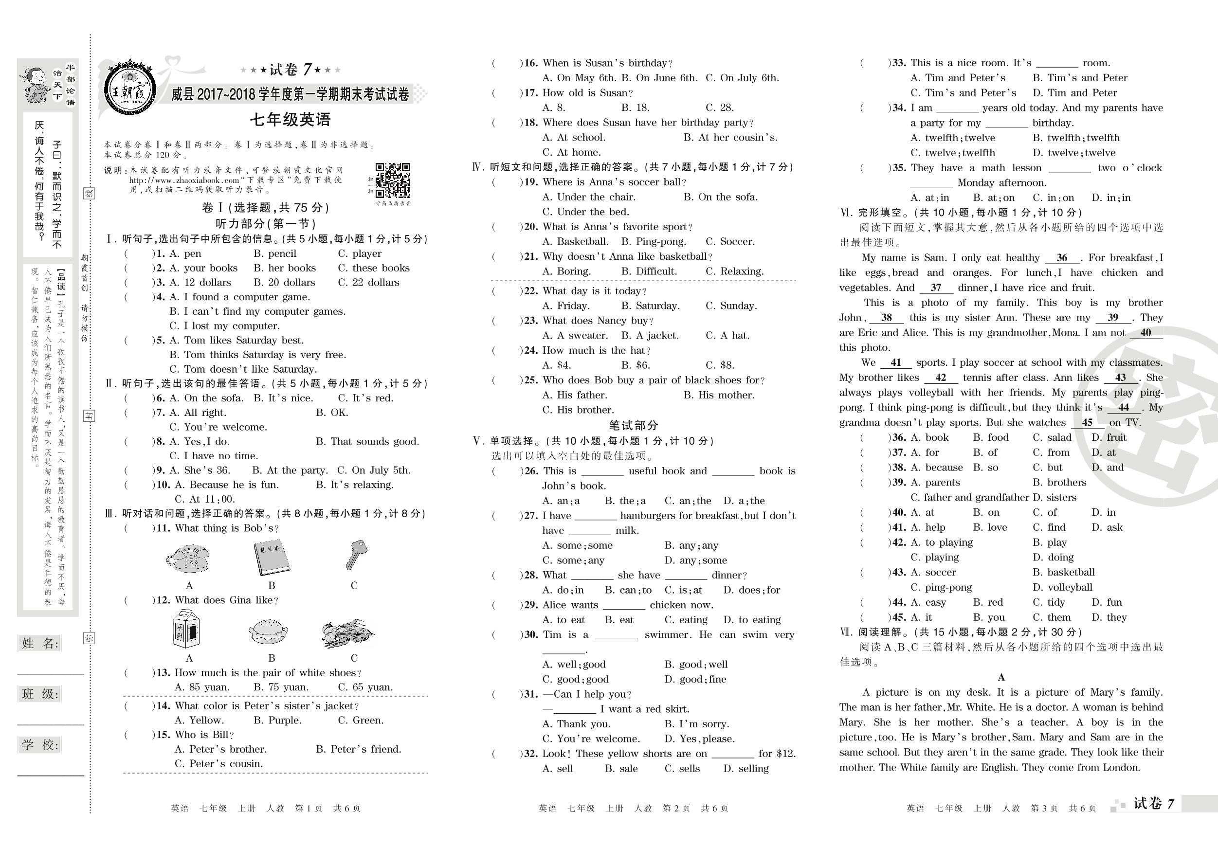 2017-2018学年第一学期邢台市威县七年级英语试卷(人教版)【7】