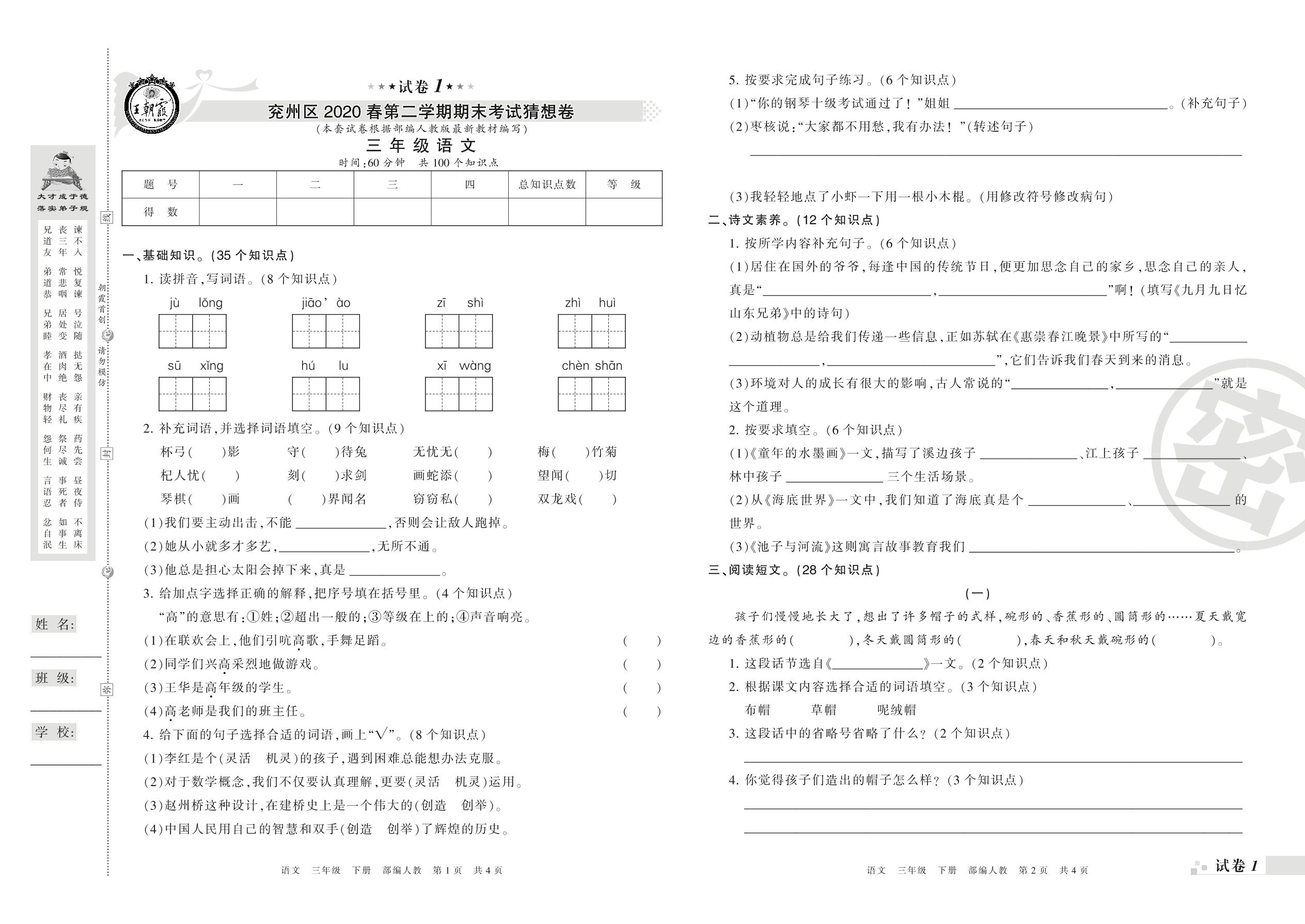 2018-2019学年第二学期济宁市兖州区猜想卷三年级语文试卷(人教版)【1】