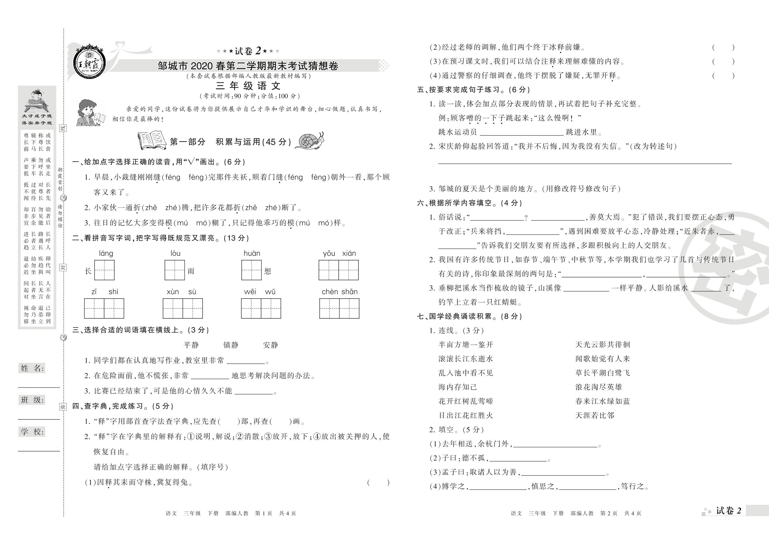 2018-2019学年第二学期邹城市猜想卷三年级语文试卷(人教版)【2】