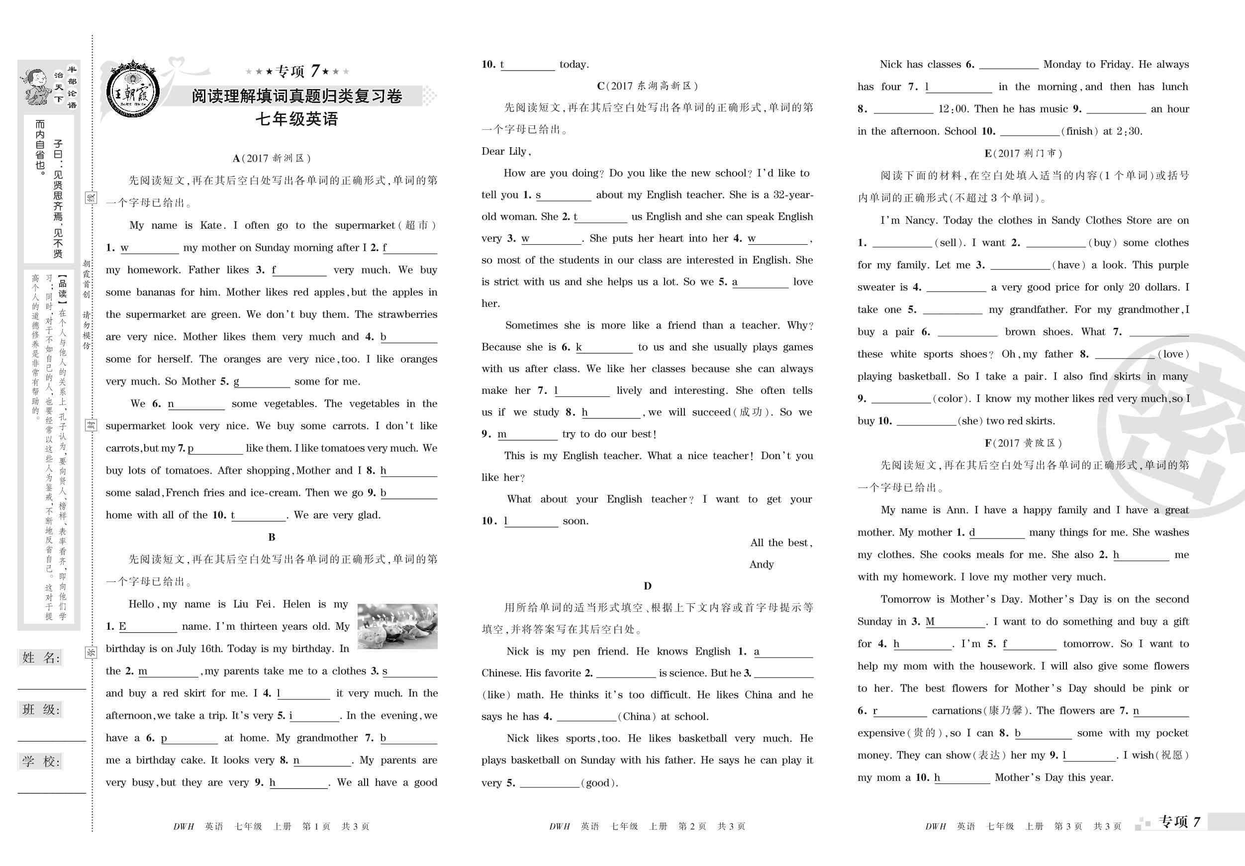 王朝霞期末专项卷——阅读理解填词、书面表达真题归类复习卷七年级上册英语(人教版)_R210807215022【0】