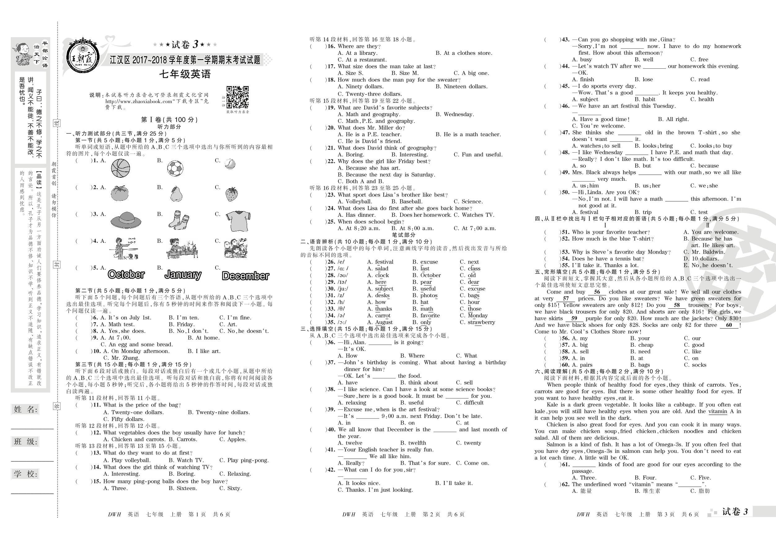 2017-2018学年第一学期武汉市江汉区七年级英语试卷(人教版)【3】