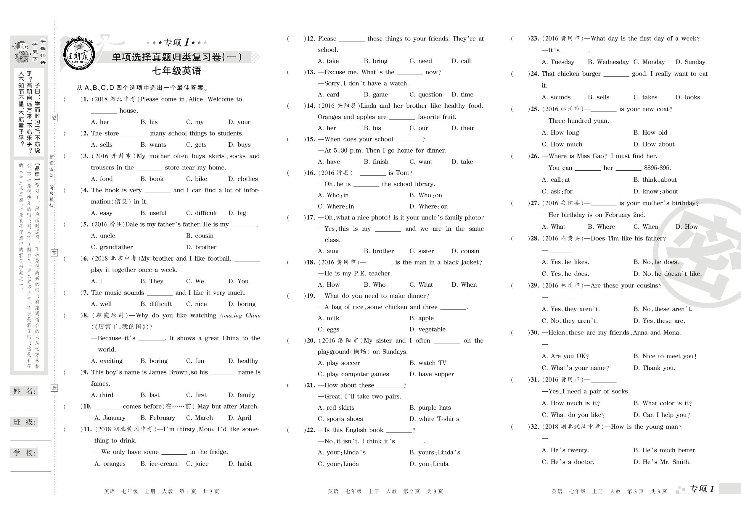 王朝霞期末专项卷——单项选择(一)(二)真题归类复习卷七年级上册英语(人教版)_R210807215211【0】