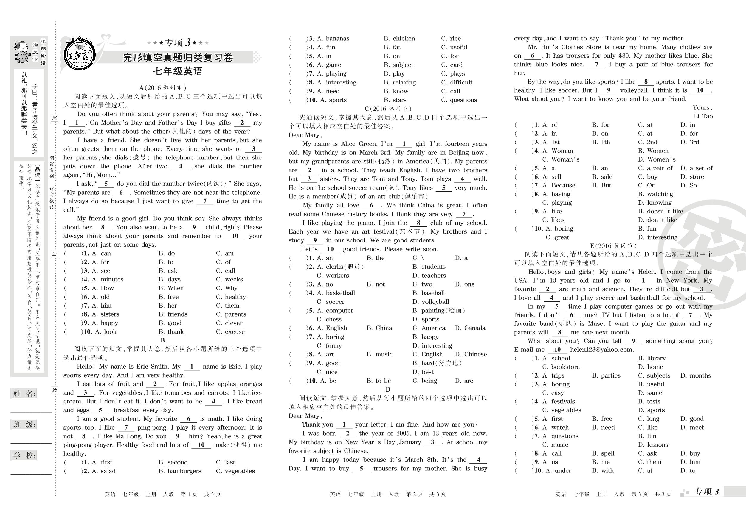 王朝霞期末专项卷——完形填空、选择型阅读真题归类复习卷七年级上册英语(人教版)_R210807215216【0】